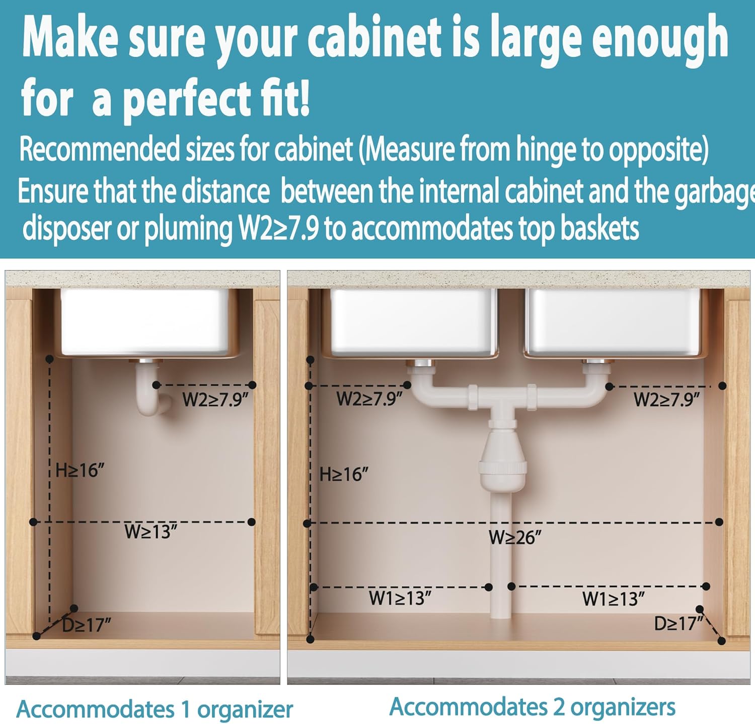 - Applicate Cabinet Size: If placing a sink organizer, the cabinet dimensions would be at least Width:13", Depth:17", Height:16". For two sink organizers, the cabinet dimensions should be at least Width:26", Depth:17", Height:16". And please check for obstructions at back of cabinet ( plumbing, garbage disposal, etc).