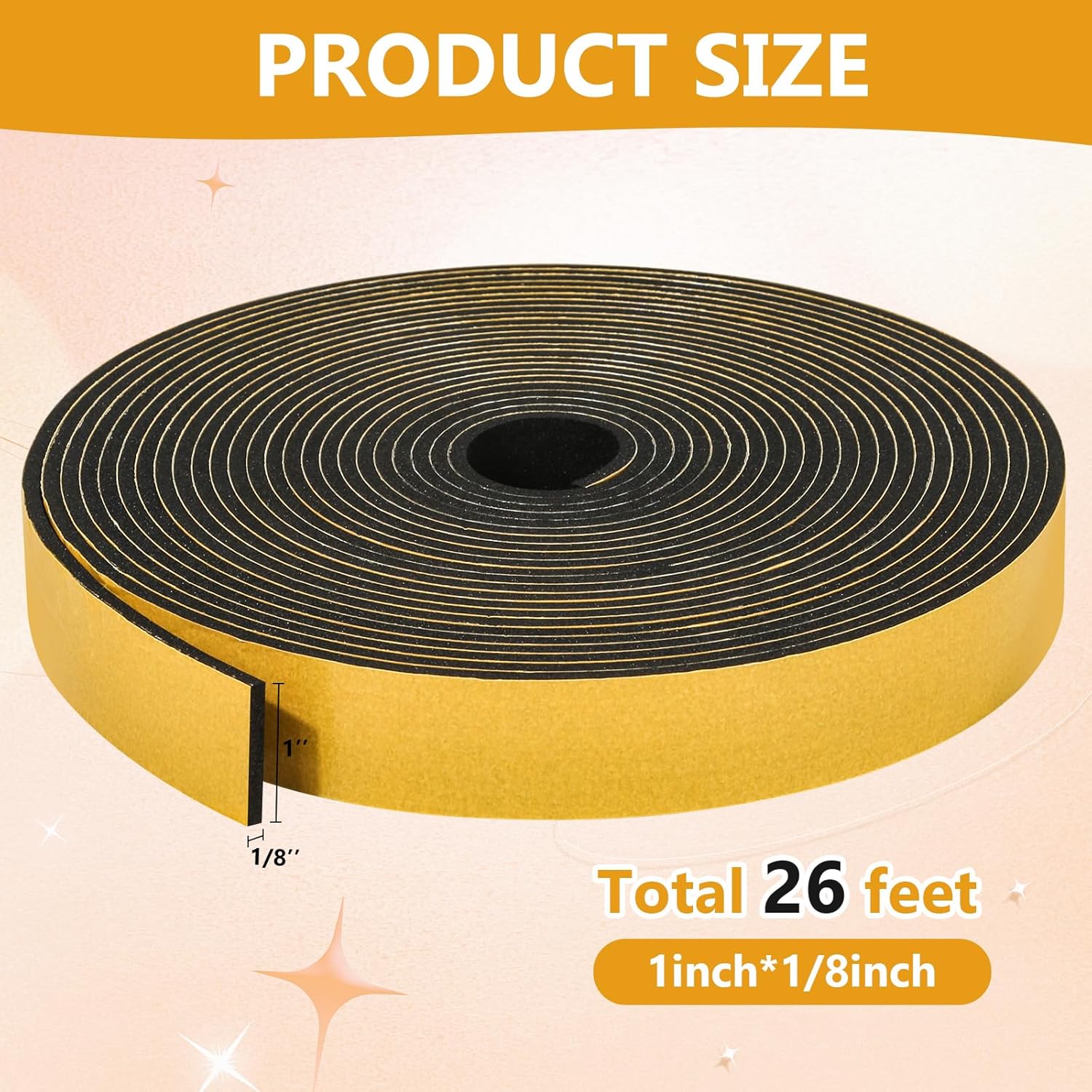 26Feet Weather Stripping Seal (1 Inch X 1/8 Inch) for Door Window, High Density Foam Tape, Soundproofing, Insulation Strip, Door Sealers for Door Frame- Black