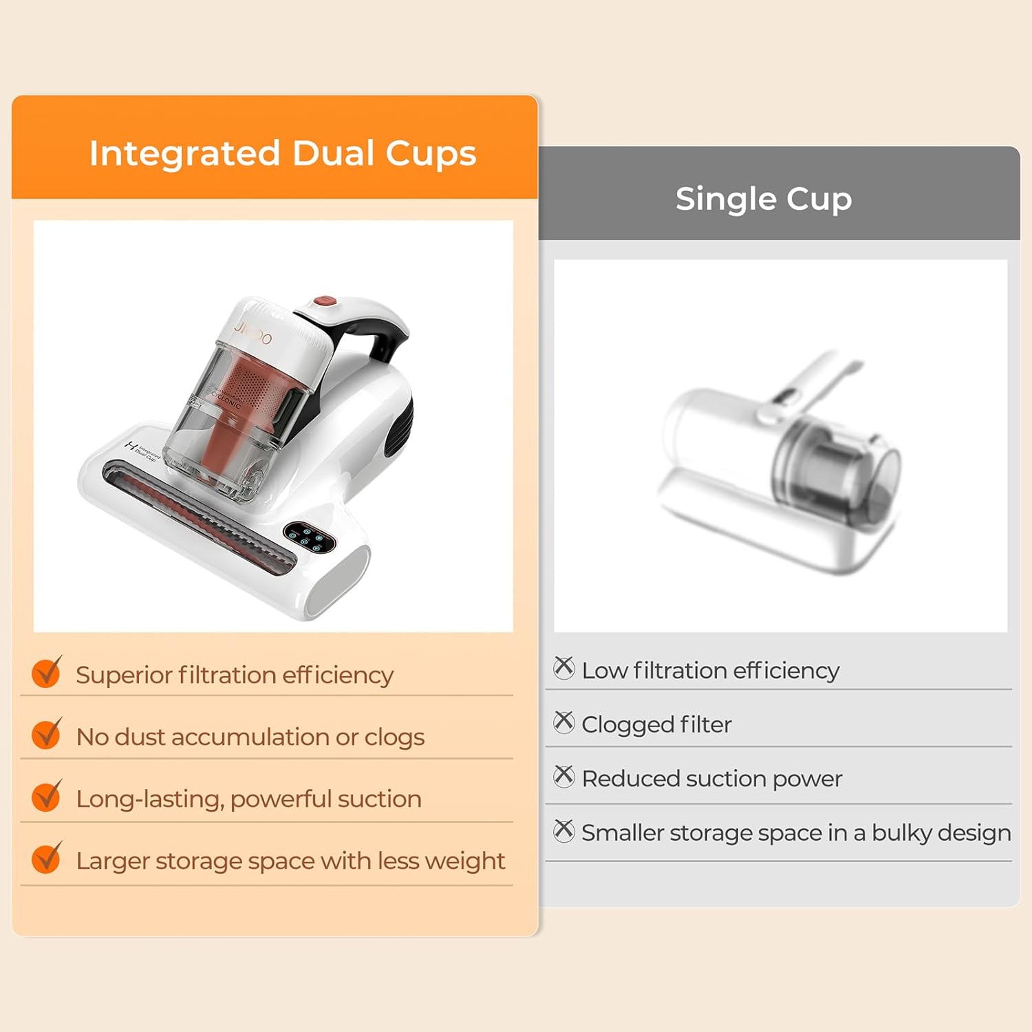 - 【High Efficiency HEPA Filtration】Our mattress vacuum cleaner with premium HEPA filter that deeply purifies and releases fresh air,captures 99.9% of particles as small as 0.3 microns, separate dust and hair without any leaks, ensuring clean air output and block the twice pollution effectively. Original integrated upper and lower dual-cup structure, patented dual cyclone filtration tech, for deep cleaning mattresses and sofas, bedding, carpets more efficient , achieves optimal results.