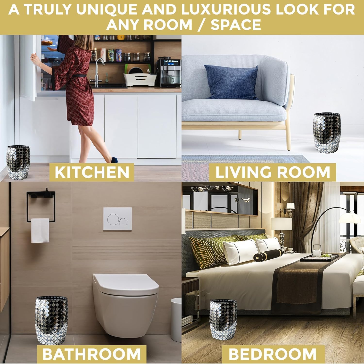 - Versatile Mosaic Glass Decor - Add a touch of glamour to any room with this small Trash Can, enhancing the ambiance in bathrooms, bedrooms, offices, kitchens, living rooms, or any open area.