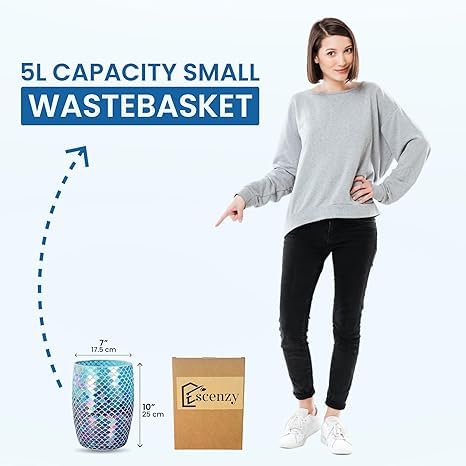 Escenzy Mermaid Bathroom Trash Can Mosaic Glass 5L | Decorative Small Garbage Can | 7" x 10" | Luxury Waste Basket for Restroom, Office, Bedroom & Kitchen | Shiny Glass Mermaid Bathroom Accessories
