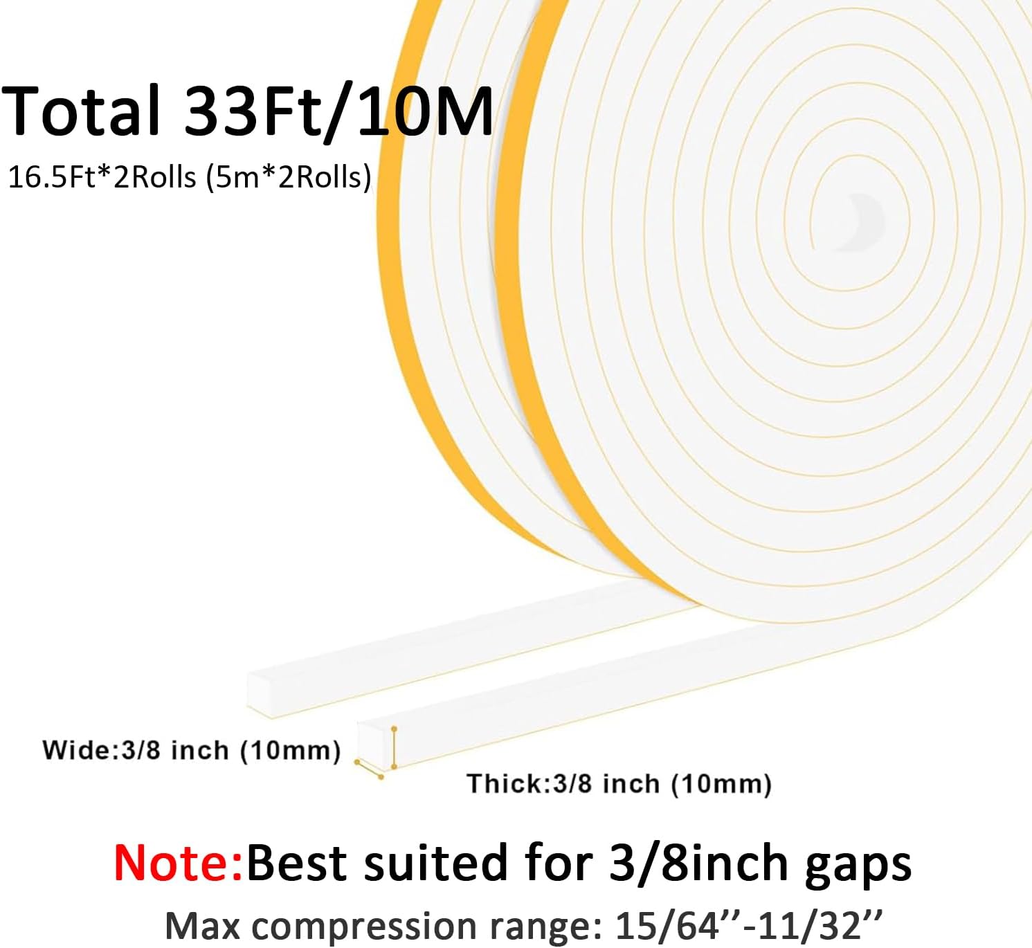 Door Weather Stripping for Doors and Window, Window Insulation Door Seal Tape, Self Adhesive Foam Gasket Tape, Foam Seal Strip Sliding Door Weather Strip, Energy-saving(3/8 in x 3/8 in x 33Ft)
