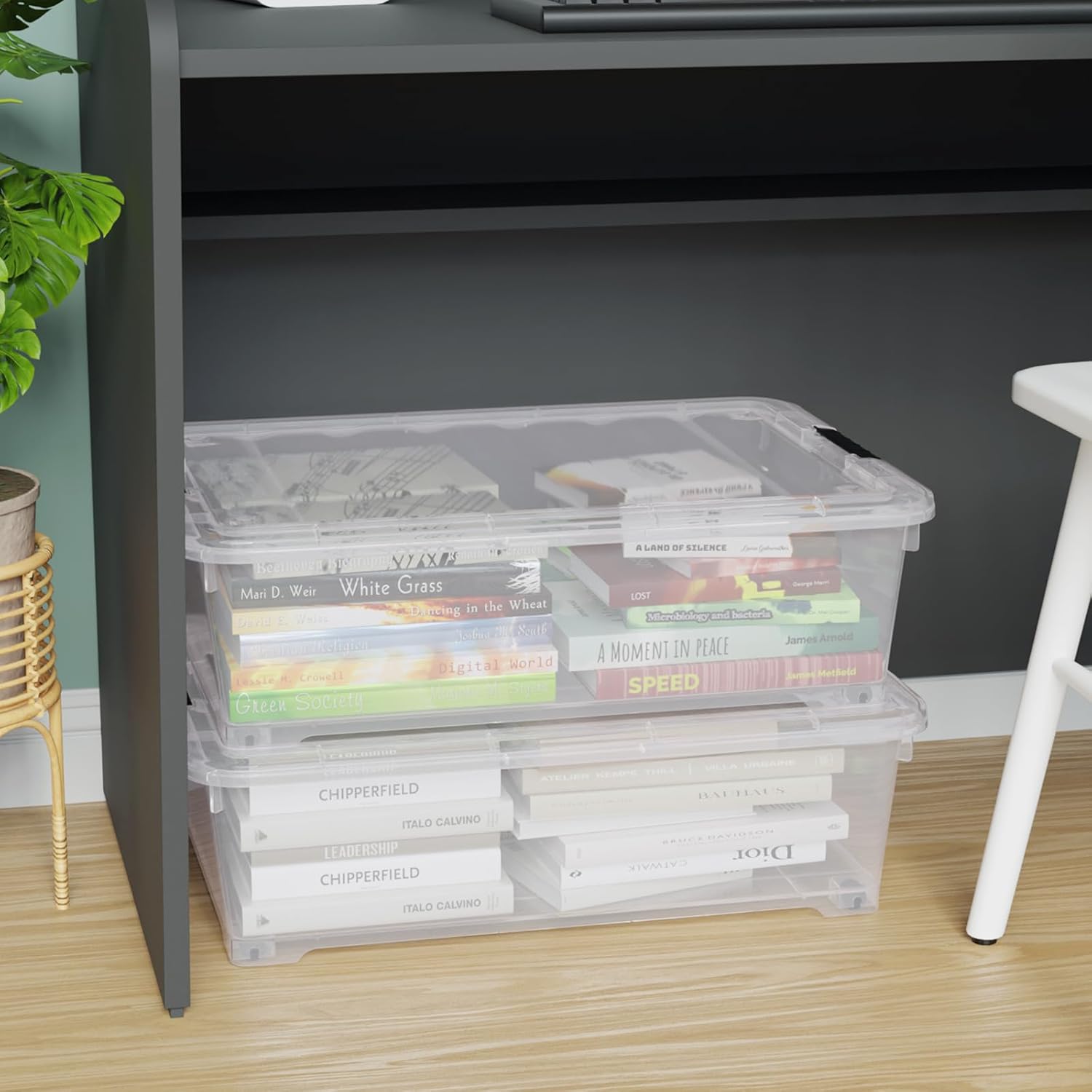 4 Pack Multipurpose 25 Qt Underbed Secure Latching Bin, Plastic Storage Container with Snap-On Lid and Wheels, Clear