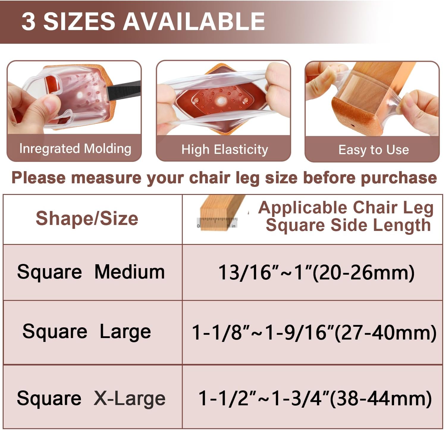 - [Applicable size range]- Our chair leg protectors are made of stretchable silicone, with a narrow top and wider bottom to adapt to different chair legs. Square X-large fits chair legs with a side length of 1-1/2" to 1-3/4" (38-44mm).Please measure your chair leg size before purchasing.