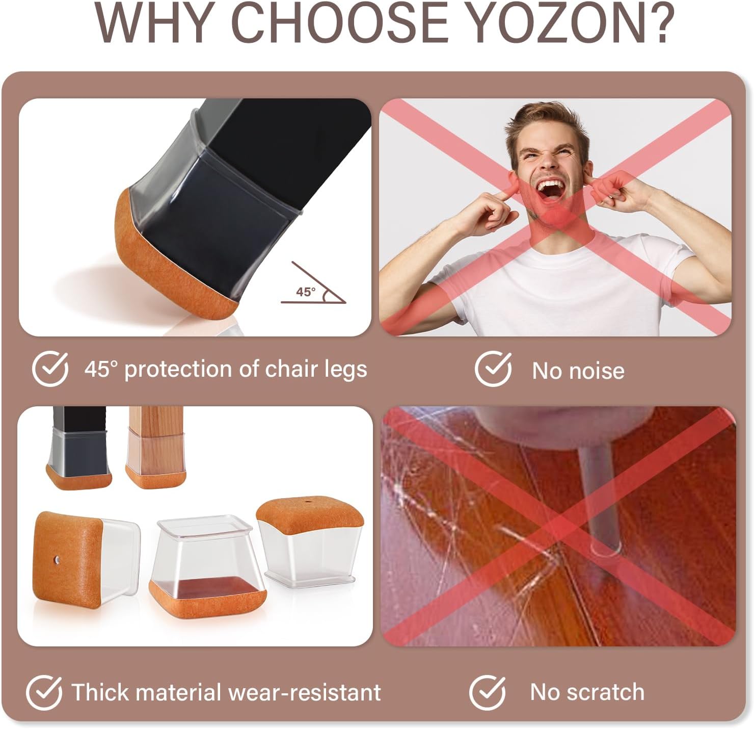 - [Reinforced bottom felt pad]-These chair leg protectors are designed for angled chair legs. The upgraded cup-shaped felt pad grips the chair legs securely. Even when the chair is tilted, it stays stable while protecting your floors from scratches and noise.