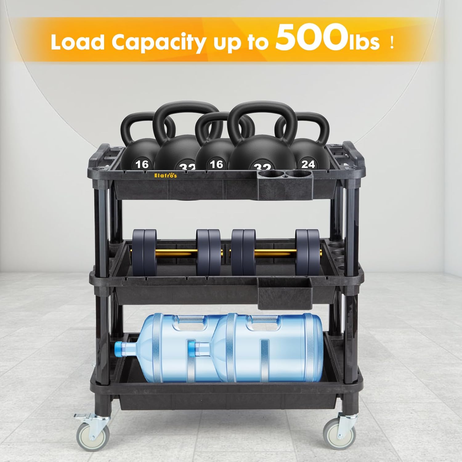 ELAFROS Multi-Use Utility Cart - 32.4x18.3 Heavy-Duty Service Cart with 3 Deep Shelves, Industrial-Grade Tool Cart Mobile Organizer, Rolling cart Holds up to 500 lbs, Black