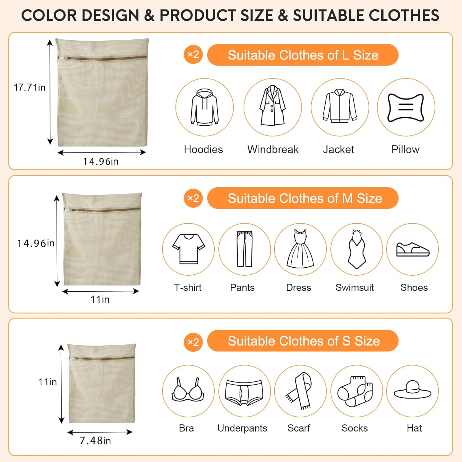 - 【 Packaging List 】 6-piece set of 3 different sizes of laundry bags (2 large: 17.71 * 14.96 inches, 2 medium: 14.96 * 11 inches, and 2 small: 11 * 7.48 inches). Different sizes of laundry nets are suitable for clothes of different sizes. Make your clean life easier!