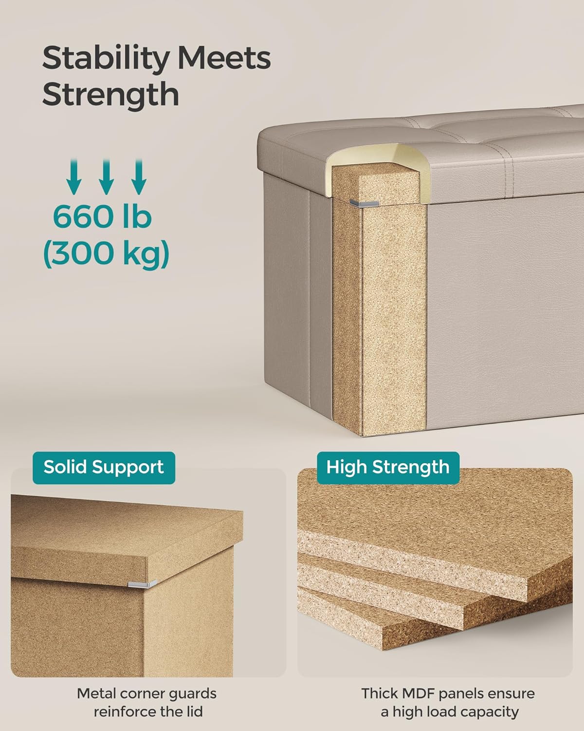 - 【GREAT STRENGTH】Built with thick MDF panels and reinforced with metal corner guards on the lid, this storage chest is strong enough to hold up to 660 lb (300 kg), so you can sit on it with your mind at ease