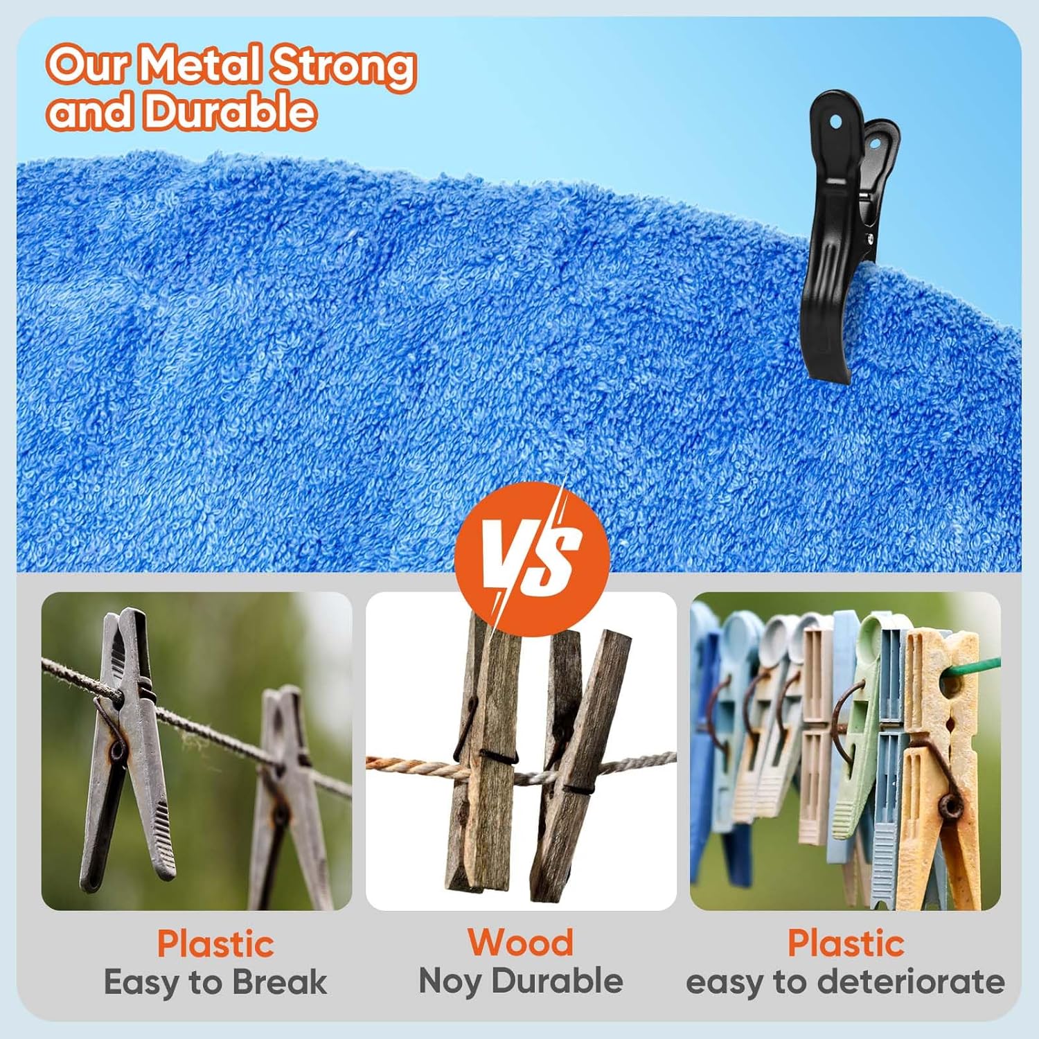 - Black beach chair clips: these beach towel clips are made of high quality steel with electroplated surface to prevent anti-rust and anti-corrosion , compared to plastic clips, metal towel clips for chairs are stronger and won't fade or break over time