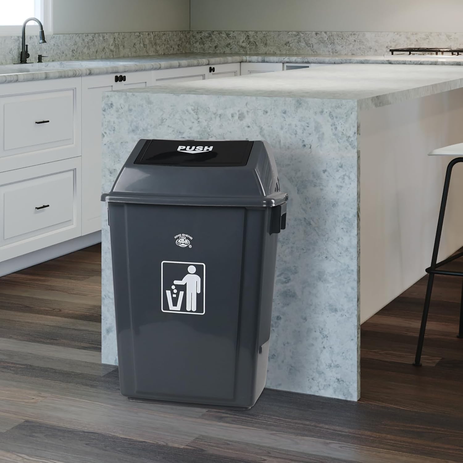 - Swing top cover can be automatically and gently closed after throwing rubbish, the trash are out of sight and odors are preclude emission