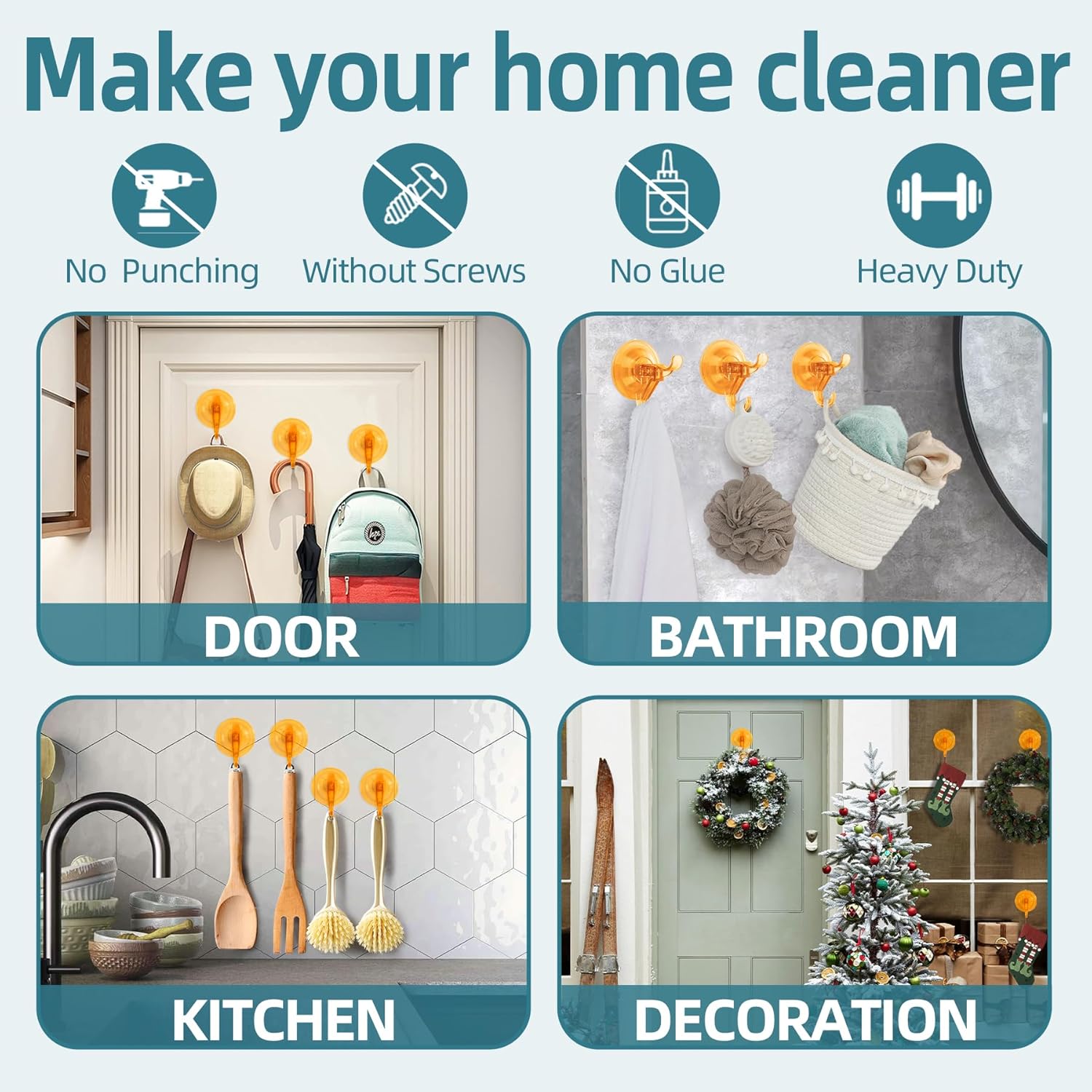 Antimbee 3 Pack Suction Cup Hooks, Wreath Hangers, Removable Small Suction Cups for Shower, Bathroom, Glass, Door, Windows, Kitchen-Up to 11 lbs on Smooth Surface (Transparent Orange)