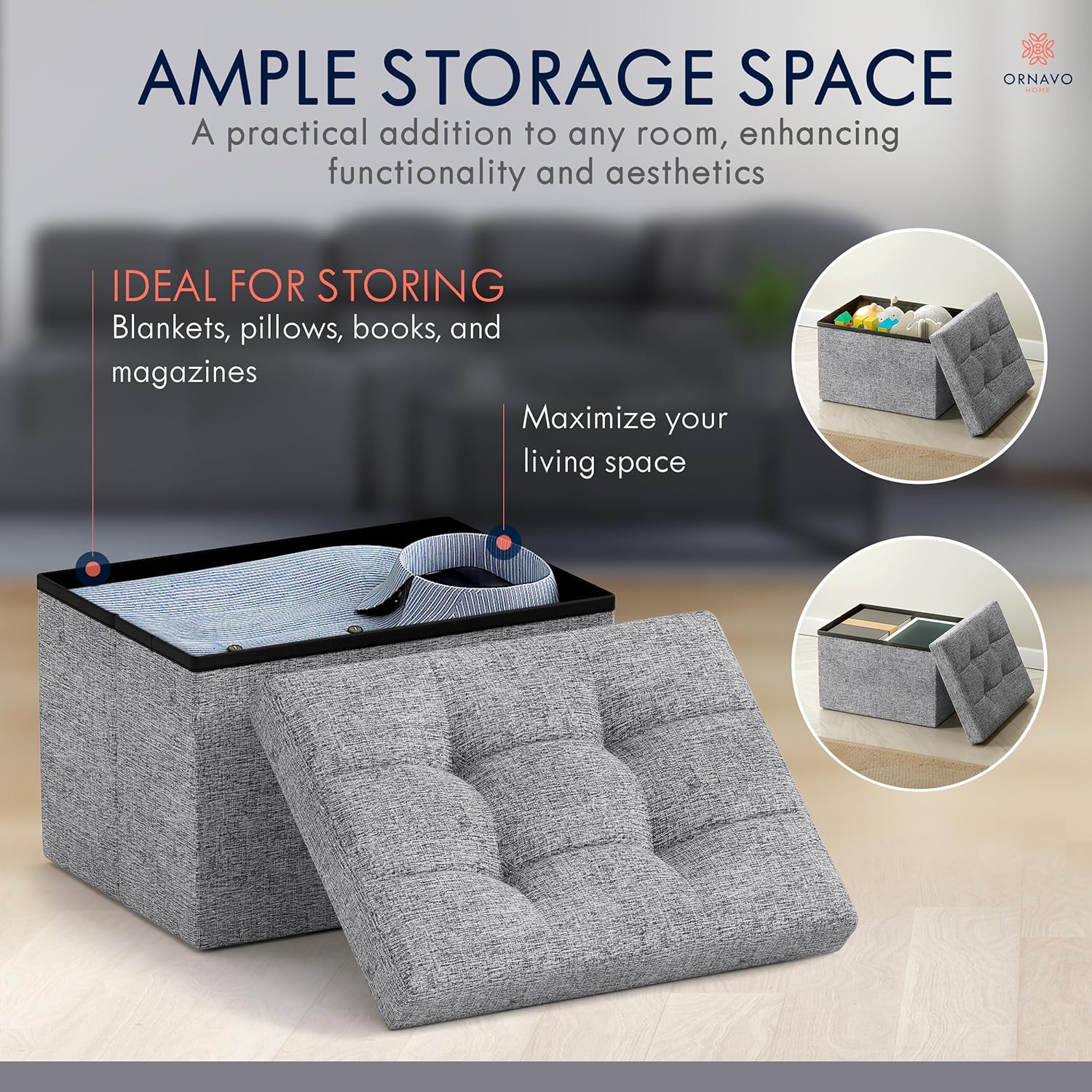 - AMPLE STORAGE SPACE: This ottoman also offers ample storage space, which is crucial for keeping your living space clutter-free. With its spacious interior, you can store anything from extra blankets and pillows to books and magazines, making it a practical and functional addition to any room.
