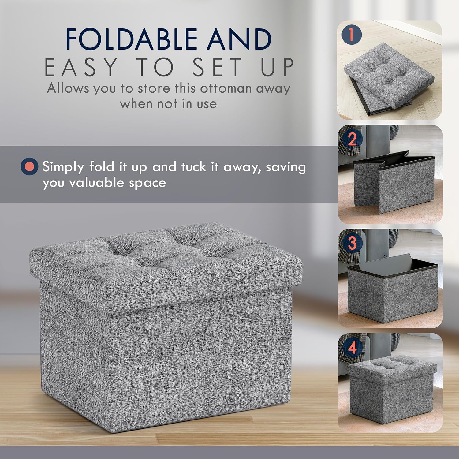 - MULTI-USE OTTOMAN - This versatile piece is not only functional, but also stylish and space-saving. Crafted from high-quality linen, this ottoman is both durable and comfortable, making it the perfect addition to your living room, bedroom, or any other space in need of additional seating or storage.