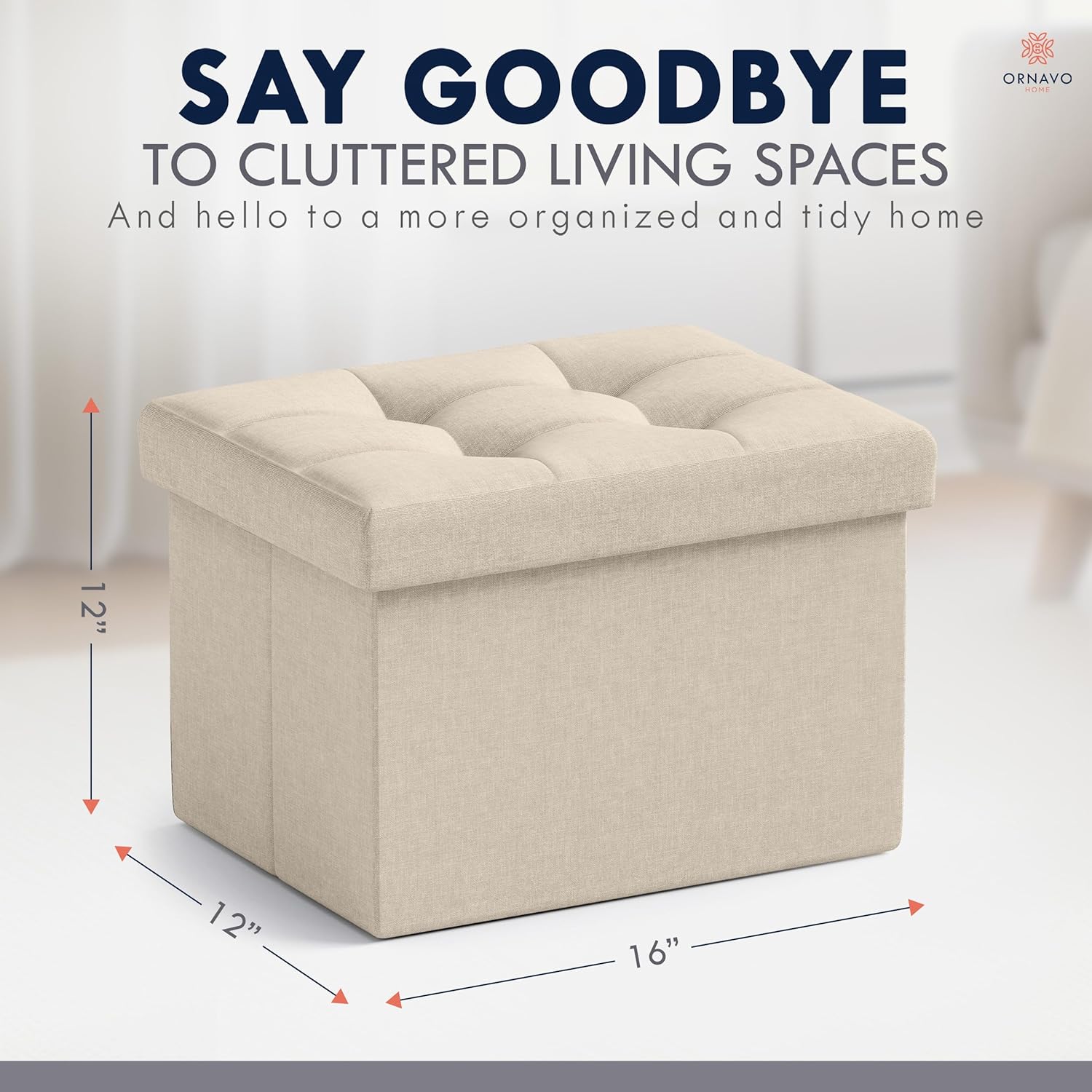 Ornavo Home Small Storage Ottoman, Set of 2, Foldable Collapsible Rectangle Linen Ottoman Foot Rest Stool Seat, for Living Room, Bedroom, Home Office, Dorm - 12 x 16 x 12, Beige