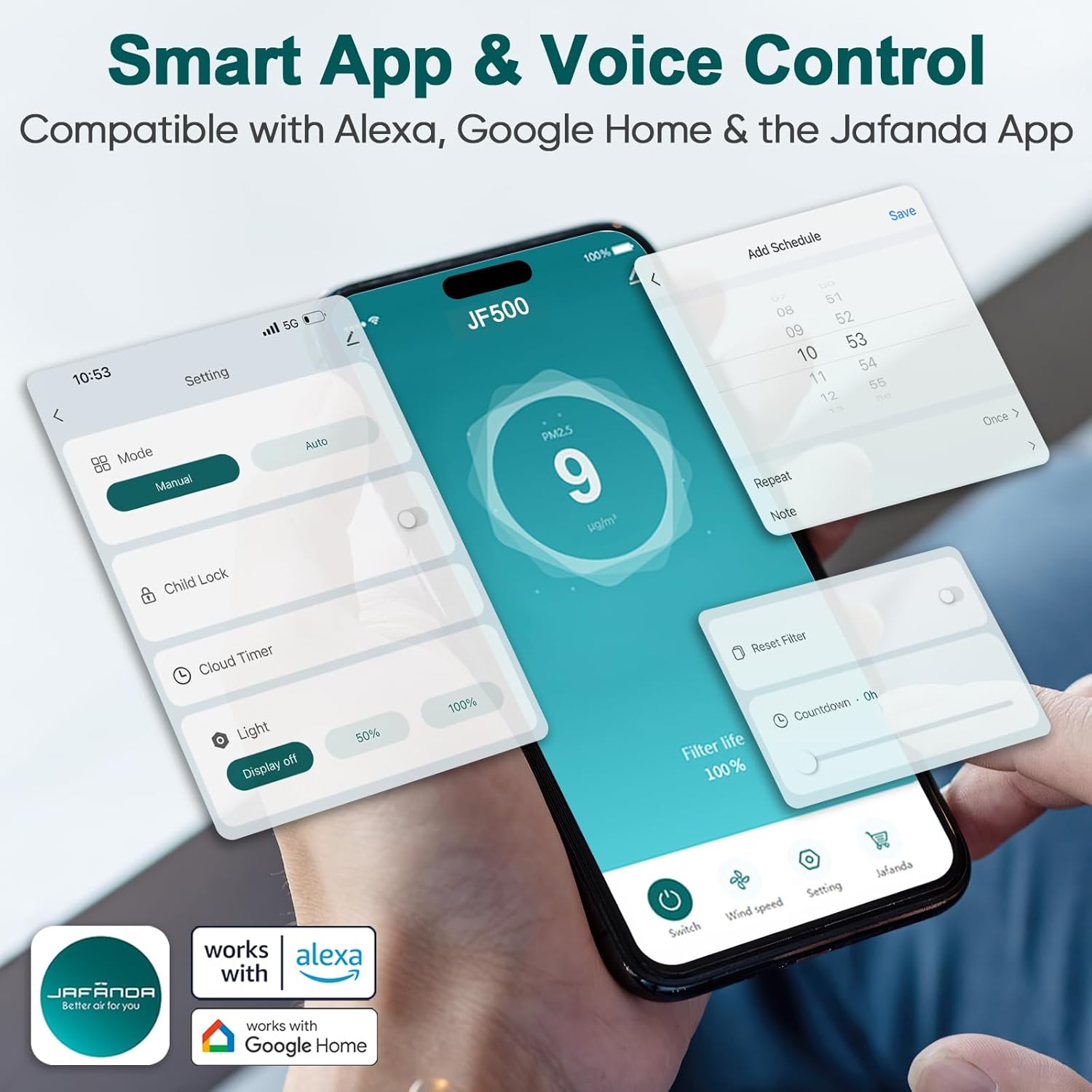 - Smart Home Integration for Easy Control:Connects to your phone via app Jafanda (iOS/Android) to adjust fan speeds, check filter life, and monitor air quality—even when you’re away. Works with voice assistants (Alexa/Google Assistant) too: just say “Hey Alexa, turn on the JF500 air purifier” for hands-free convenience