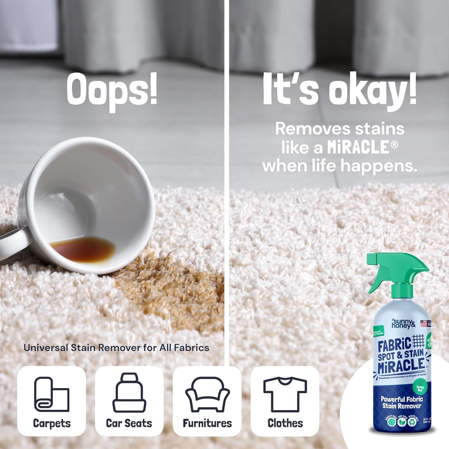 - Meet Your Clean Buddy: The Sunny & Honey Fabric & Carpet Cleaner Spray is your trusty partner for tackling tough stains and bad surface smells, perfect for a spotless, fresh home. Whether it's a couch stain or a laundry mishap, this upholstery cleaner handles it all