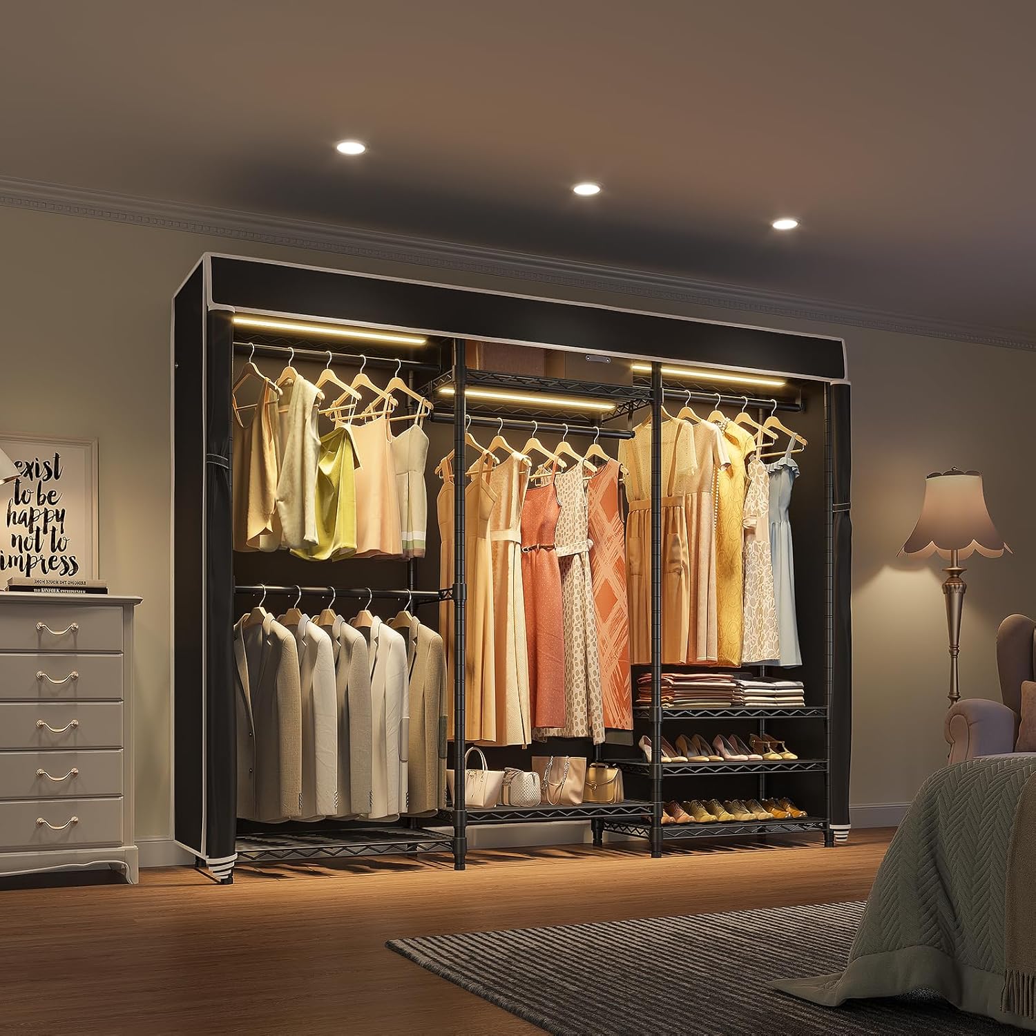 VIPEK V5LC Garment Rack Heavy Duty Covered Clothes Racks with Dimmable LED Light 3000K Warm White, Portable Closet Wardrobe Freestanding Clothing Racks for Hanging Clothes, Black Rack with Black Cover