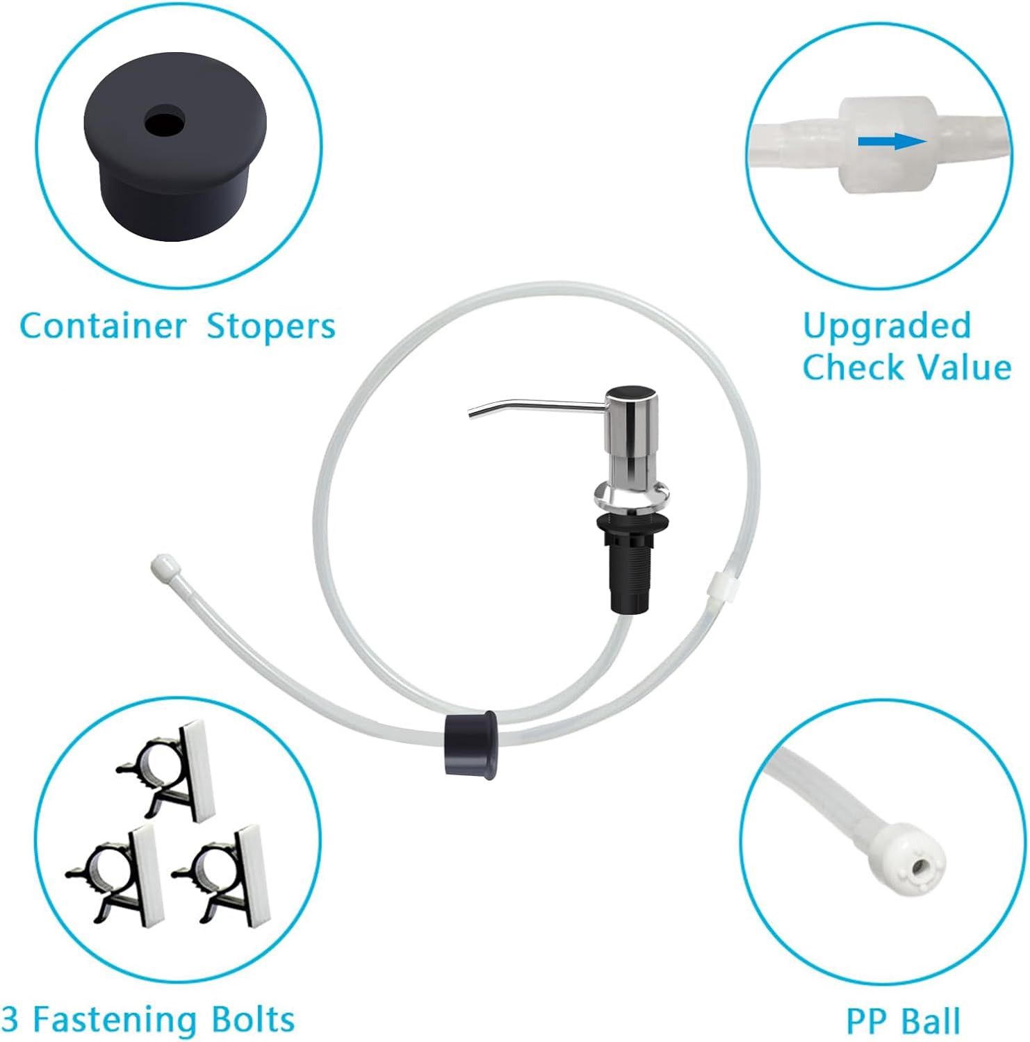 - PACKING INCLUDING -- 1 x soap dispenser pump head, 1 x 47" extension tube, 1 x soap bottle stopper, 1x check valve, 1x PP ball, 3x fastening bolts