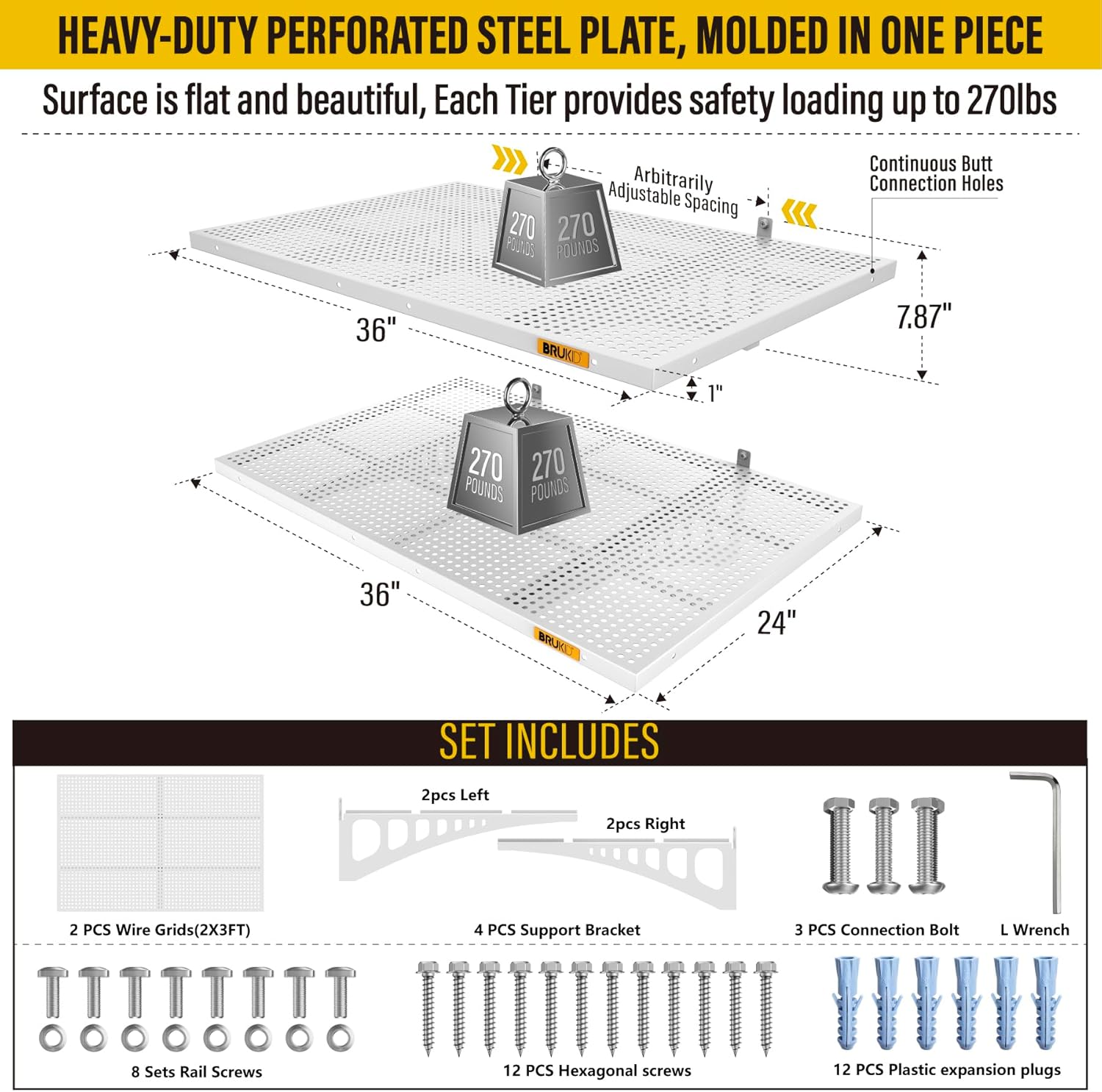 - KIT INCLUDES: Includes 2pcs of face plate; 4 Brackets; 12 Hexagonal screws (Hardened ∅0.2" L/2"); 12 plastic expansion plugs, 8 Sets of rail attachment bolts; 1 L-wrench; 1 installation manual. All the hardware of Brukid professional series wall mounted shelves are under strict quality control and testing, we strive to provide our customers with a quality shopping experience, when you receive the product encountered any problems, please contact us at the first time, we will certainly give you a satisfactory solution