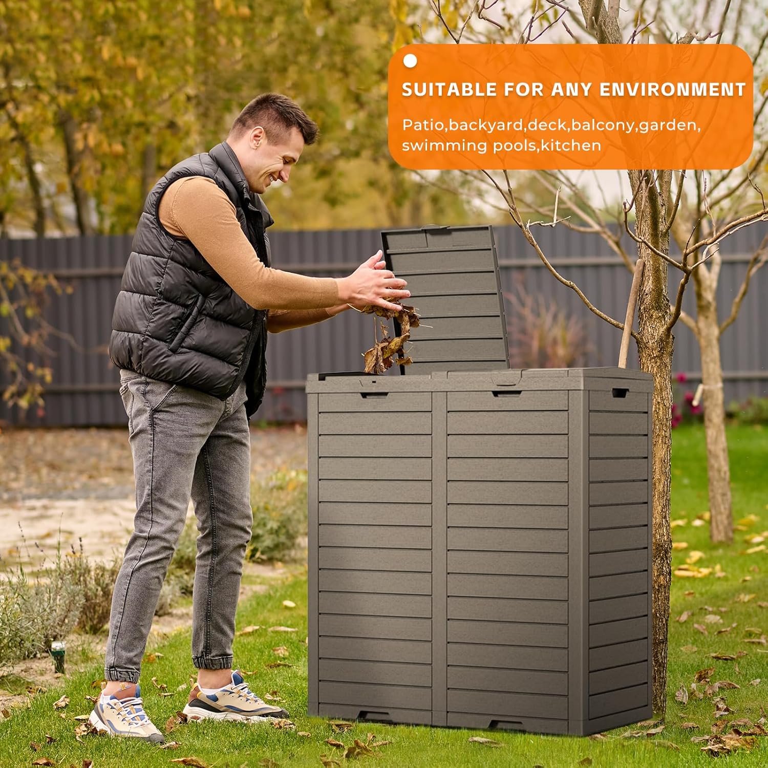 - Durable and Waterproof Material: Made from durable, recyclable resin, this outdoor trashcan is waterproof and fade-resistant. The sturdy panels are resistant to bending, warping, or breaking, providing excellent weather resistance to withstand various weather conditions.