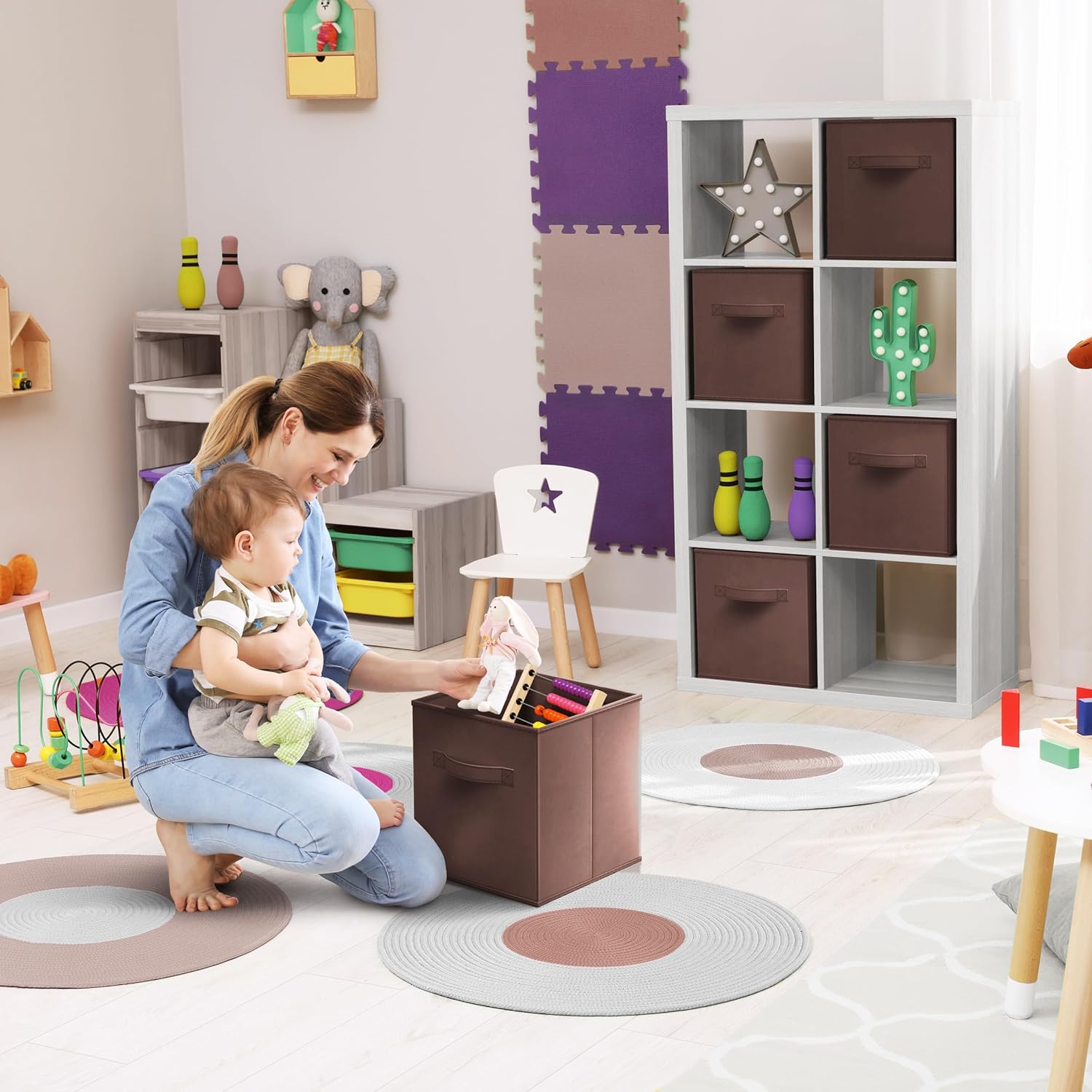 - Cubby Storage Bins Versatile Use: Use the Sorbus cube storage bins in the kid's room, toy storage, family room, laundry area, closet, storage room, etc - Sit Cube Organizer Bins on the floor, in the closet, bookcase, desk, shelving area, and cubbies
