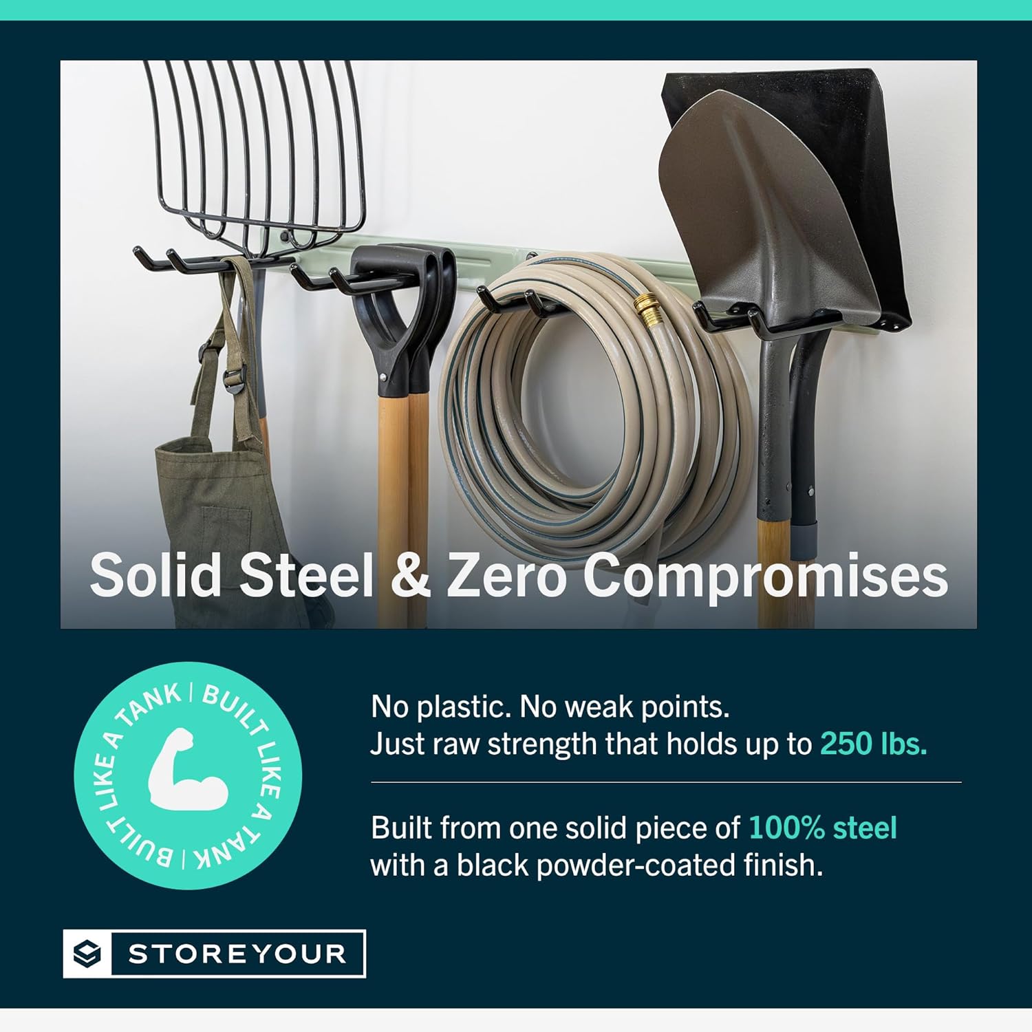 StoreYourBoard Wall-Mounted Rack With 4 Garage Hooks – Heavy-Duty Steel Holder Garage & Garden Storage for Shed, Workshop, or Home Organization – For Rakes, Shovels, Tools & More – 1 Pack, Deep Water