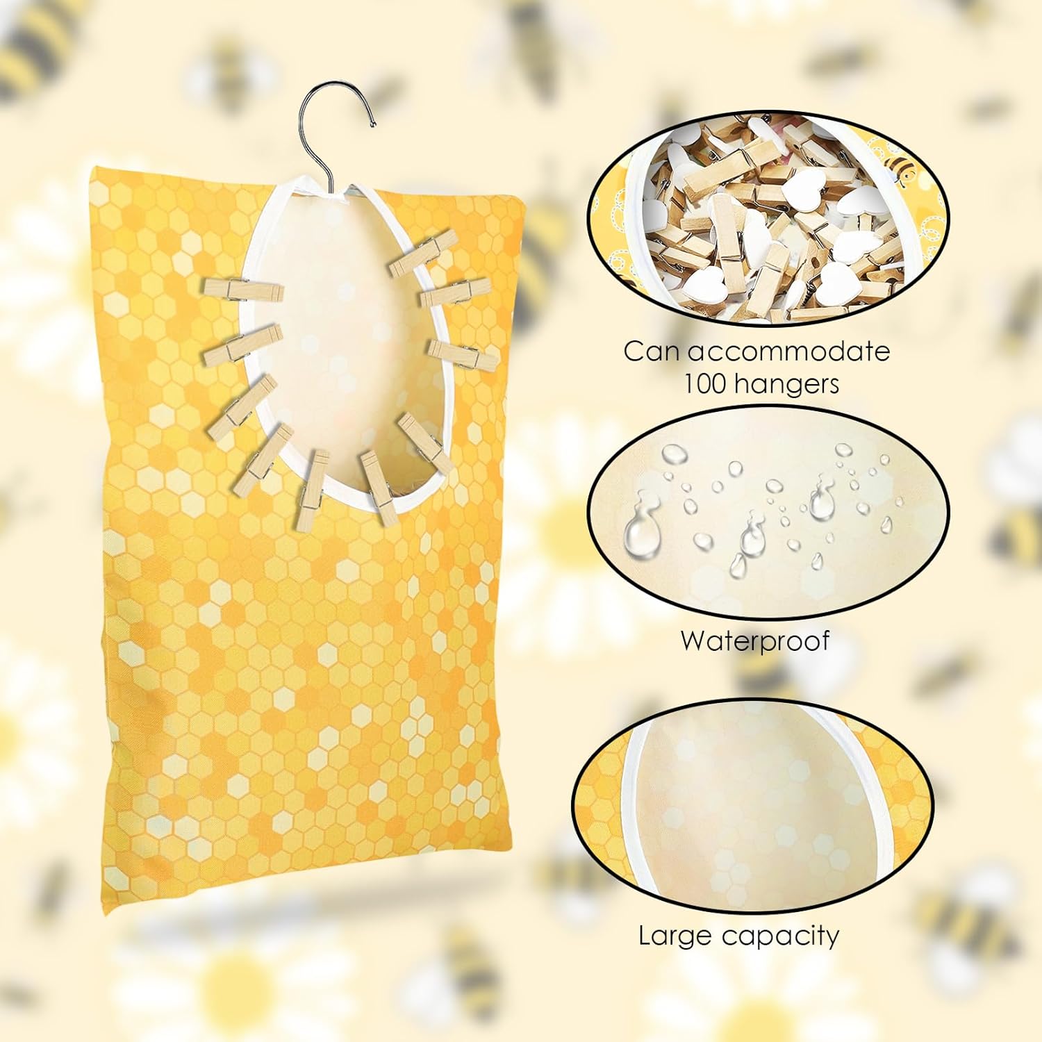 - Reliable Material: these clothes line bags are made of long-lasting canvas or water-repellent material in a beautiful bee and honeycomb pattern, durable and easy to clean. And the clothespin basket equipped with a sturdy anti-rust steel hook, lets you easily hang it on clothesline or other place. They are sturdy and durable for your long-term use
