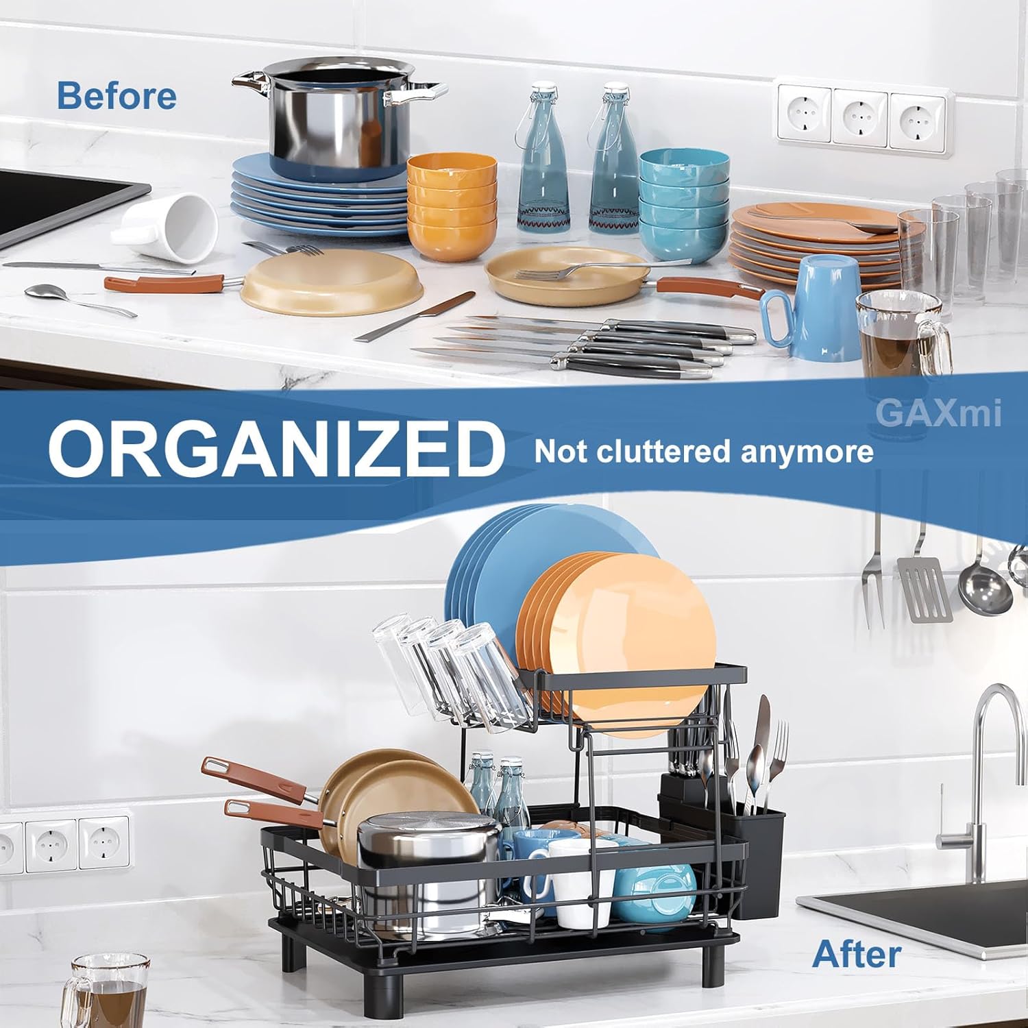 GAXmi Dish Drying Rack Over The Sink Drainer with Drainboard Utensil Holder Cup Holder, 2-Tier Black
