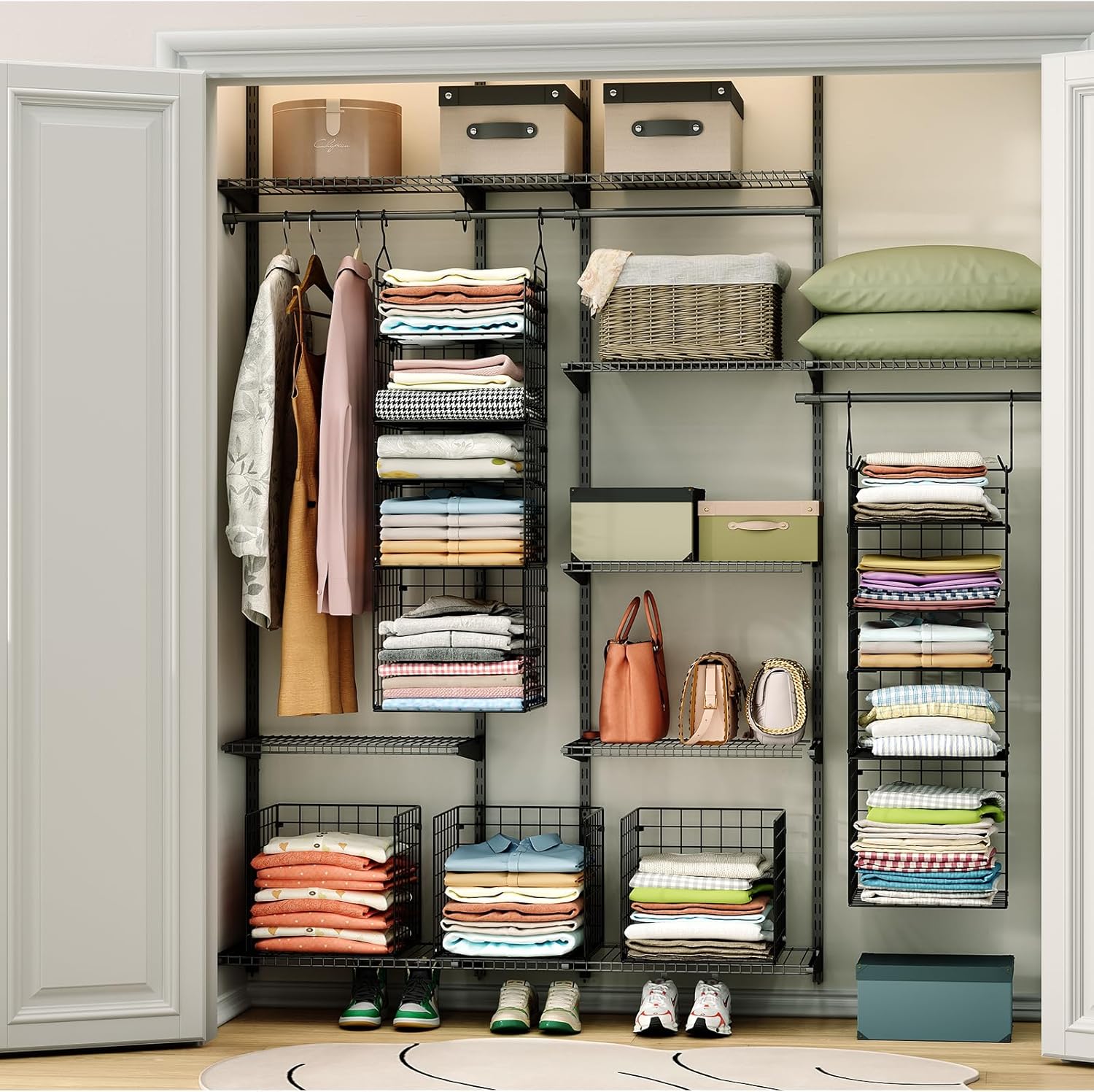 X-cosrack Hanging Closet Organizer and Storage - 5-Tier Closet Storage Organizer Baskets for Clothes & Adjustable Collapsible Metal Closet Hanging Organizer Shelves for Sweaters Shoes Handbags