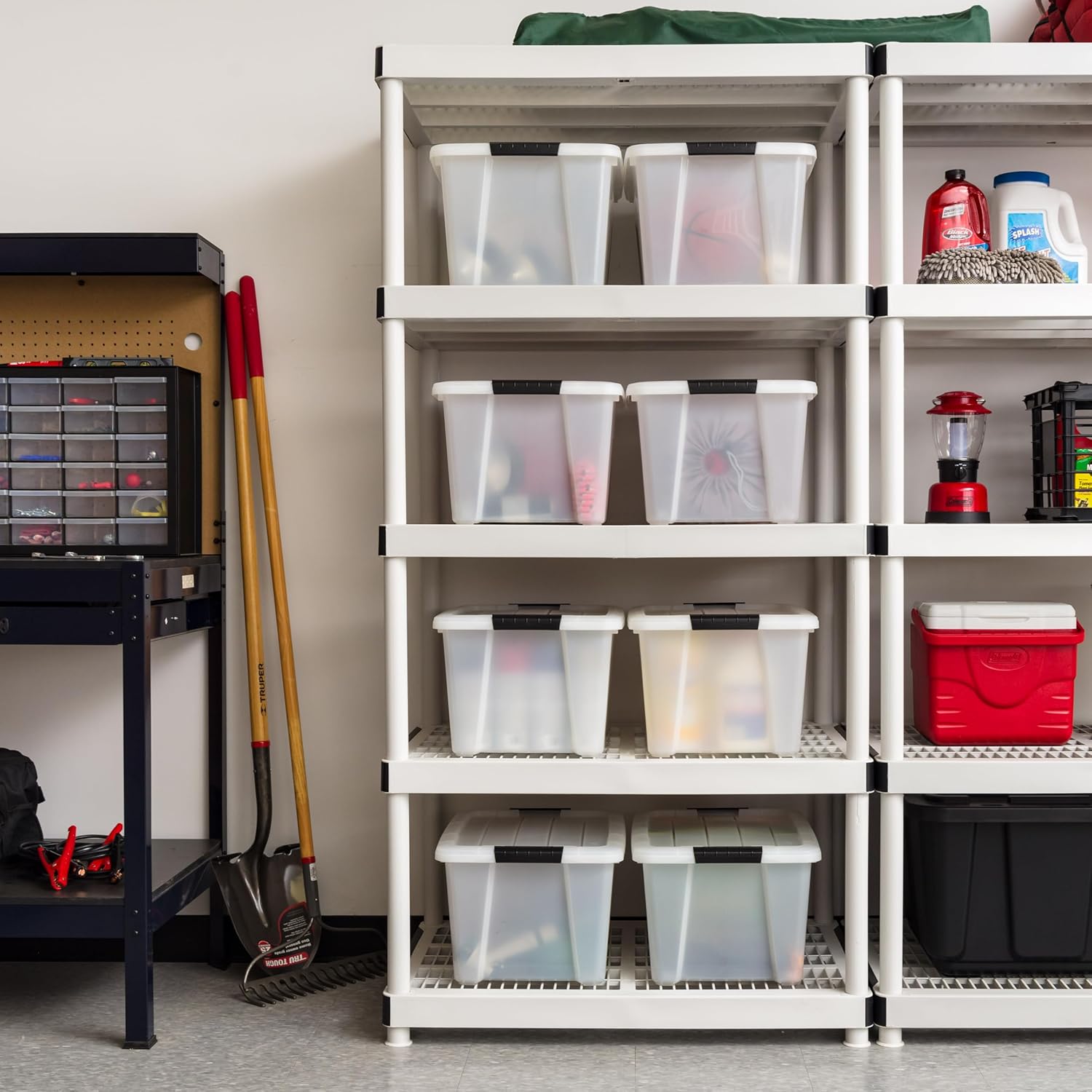 IRIS USA 33 Qt Stackable Plastic Storage Bins with Lids, 8 Pack - BPA-Free, Made in USA - Discreet Organizing Solution, Latches, Durable Nestable Containers, Secure Pull Handle - Pearl