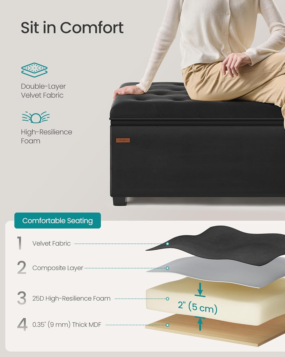 SONGMICS Velvet Storage Ottoman Bench, Foot Rest with Legs, 15.7 x 43 x 15.7 Inches, End of Bed Bench, Storage Chest, Load up to 660 lb, for Living Room, Bedroom, Entryway, Ink Black ULSF089B02