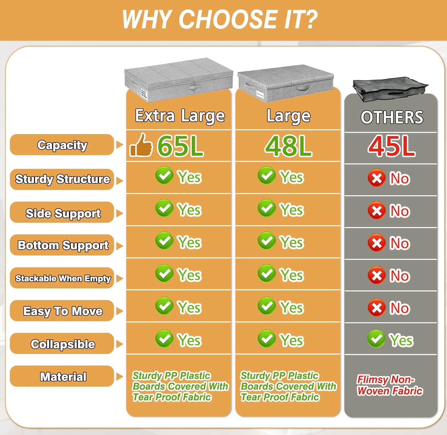 - STURDY STRUCTURE & STURDY HANDLES: Firm foldable bottom and sides, making the box more sturdy and stackable, keep it shape when empty; 3 Reinforced sewn-in handles make it easy maneuverability and convenient for you to carry and pull out from under the bed; handy bins make excellent blanket organizers and storage; Lasts longer than underbed storage containers plastic; Keep your bedroom neat and tidy with storage bins with lids that fit your room's existing decor and theme