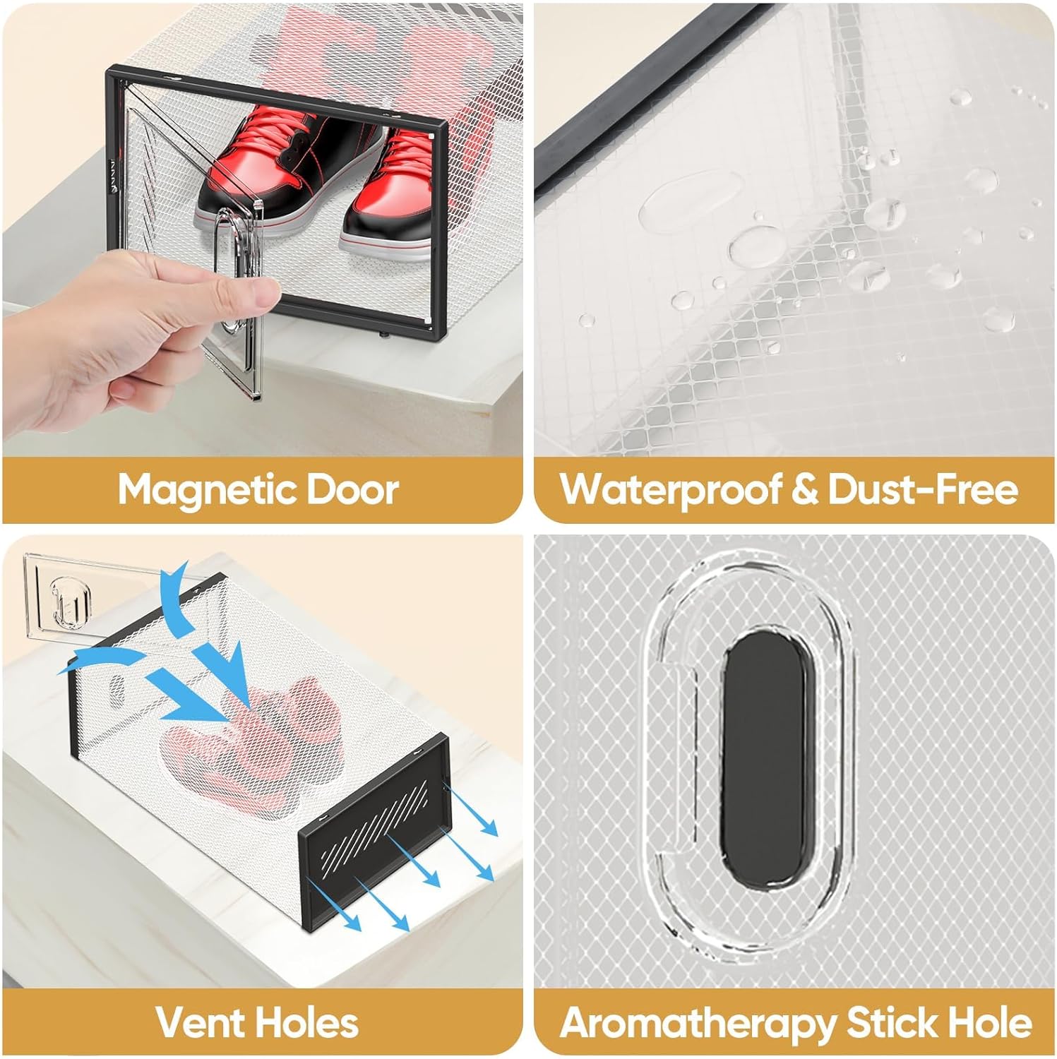 - [UPGRADE VERSION] Larger Space + Magnetic Door + Ventilation Holes + Aromatherapy Stick Hole + Thickened Material. This shoe box offers ample space for your shoes, along with a designated slot for an aromatherapy stick(not included). The door's magnetic closure provides a secure seal to prevent accidental opening.