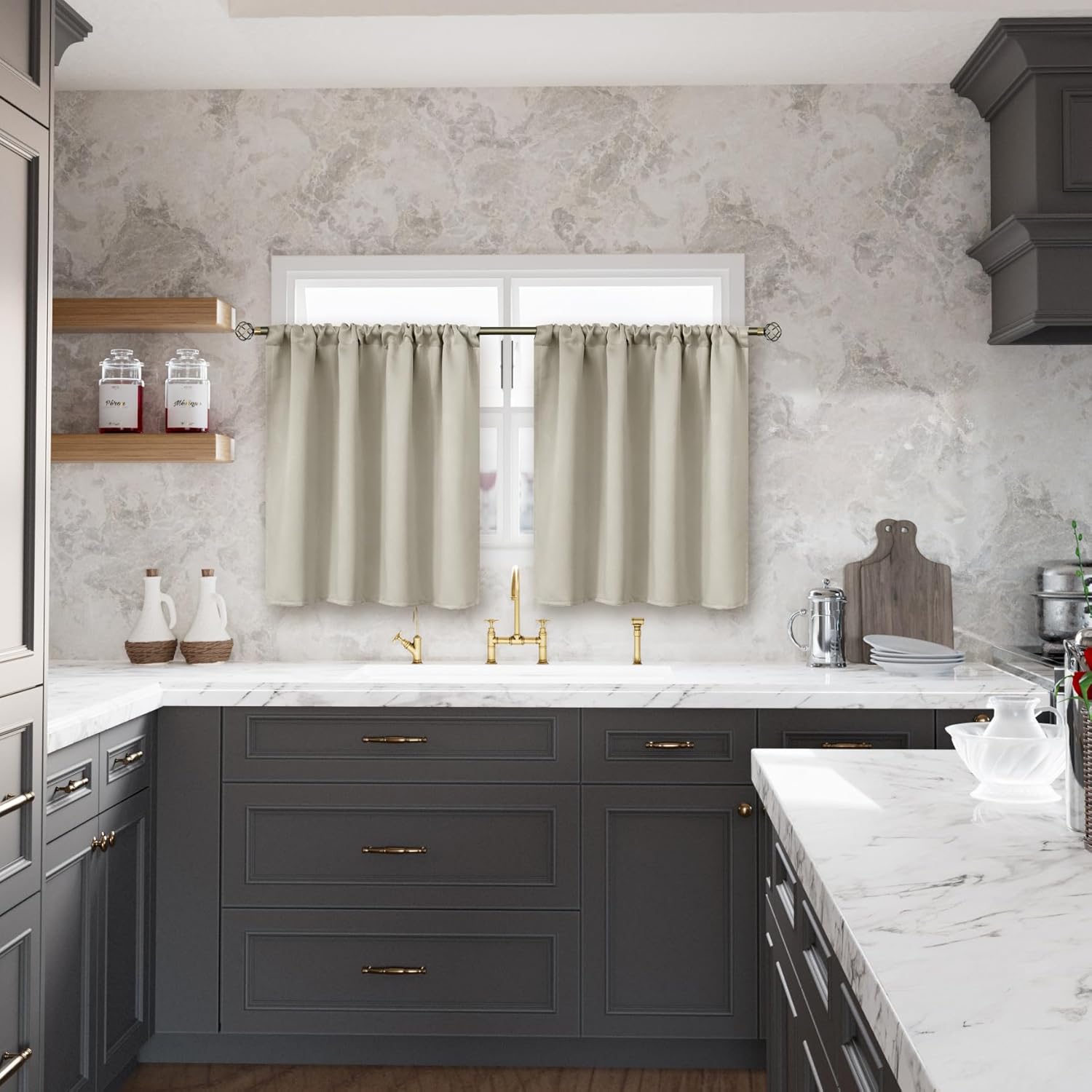 - Package Includes: Set of 2 light camel blackout curtains; each panel measures 42 Inch wide by 36 Inch long.
