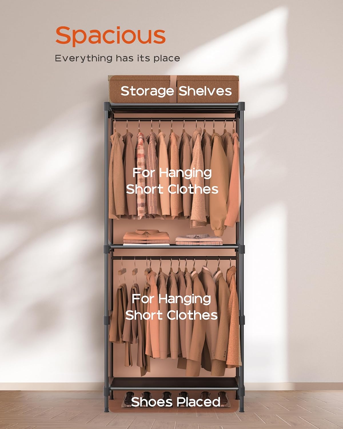 - [Stable and Strong] Featuring with steel tubing, high quality non-woven fabric and durable connectors, this wardrobe ensures long-lasting stability and support. Each hanging rod holds 44 lb and Each shelf holds up to 22 lb.