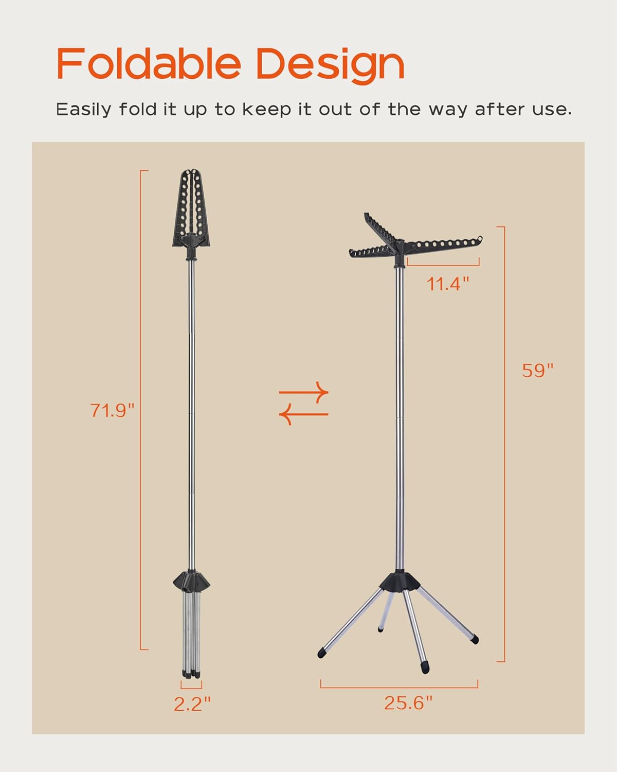 - [Foldable and Space-Saving] This vertical drying rack measures 25.6”D x 25.6”W x 59”H and takes up very little space. After use, simply fold the four legs and three drying rods into a smaller size: 2.2 "D x 2.2 "W x 71.H, which can be leaned against the footrest, perfect for apartment laundry rooms or narrow spaces and corners.