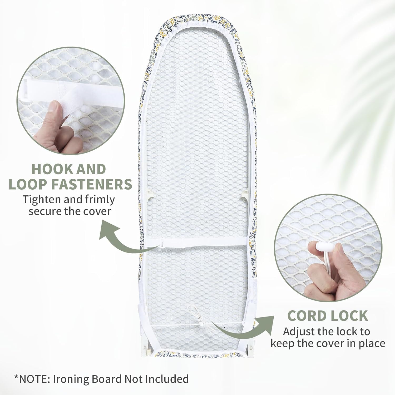 - HOOK AND LOOP FASTENERS AND ELASTICIZED EDGES: Come with two hook and loop fasteners can pull the cover surface tight and straight with tension straps for universal fit. The tailor made high quality elastic skirt can firmly fix the ironing cover so that it is tightly attached to the ironing board