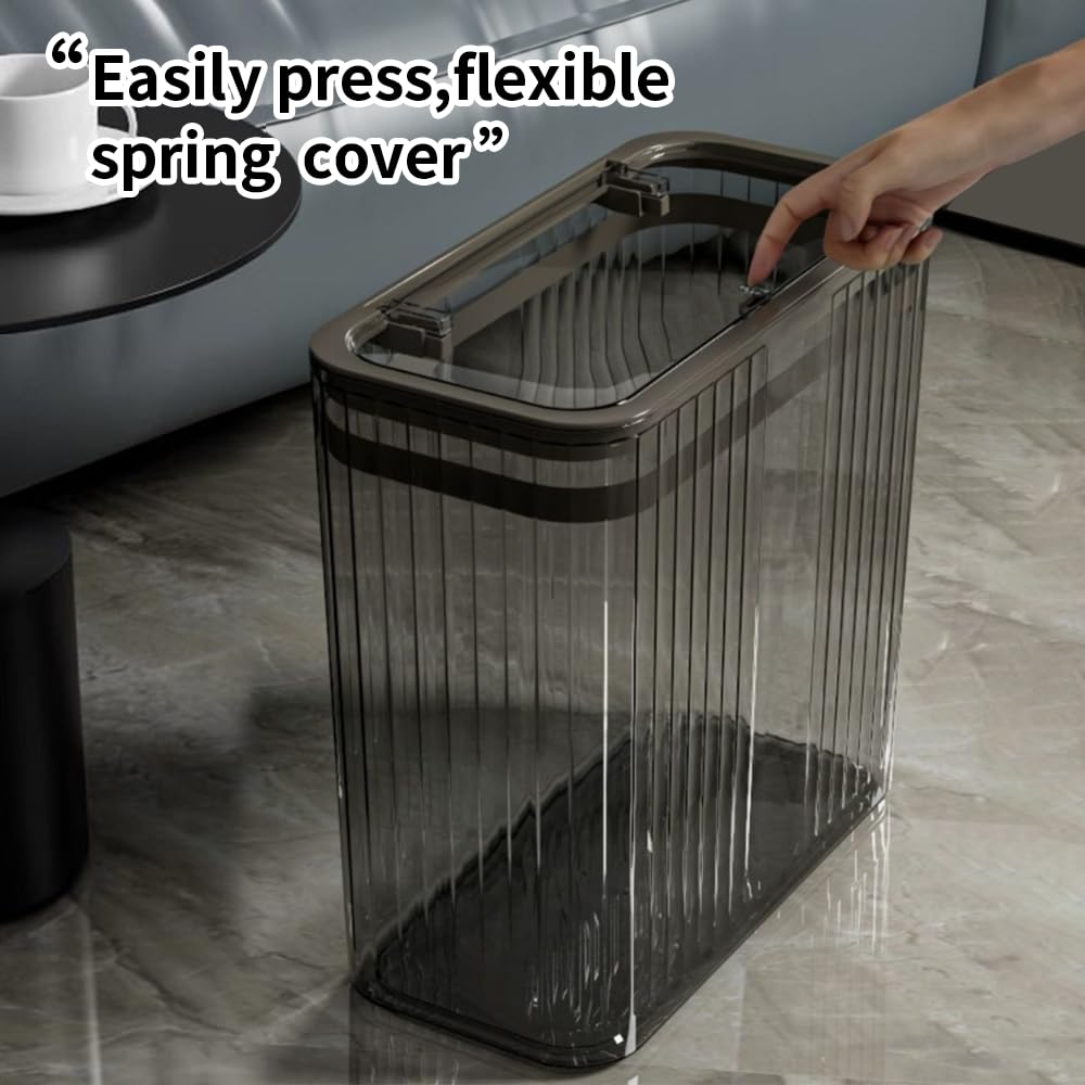 - 【Narrow Design】Size: 12.52*5.90*11.61 inches. The transparent garbage can with narrow design is suitable for any room in your home, especially for the corner, and it won’t take up much space.