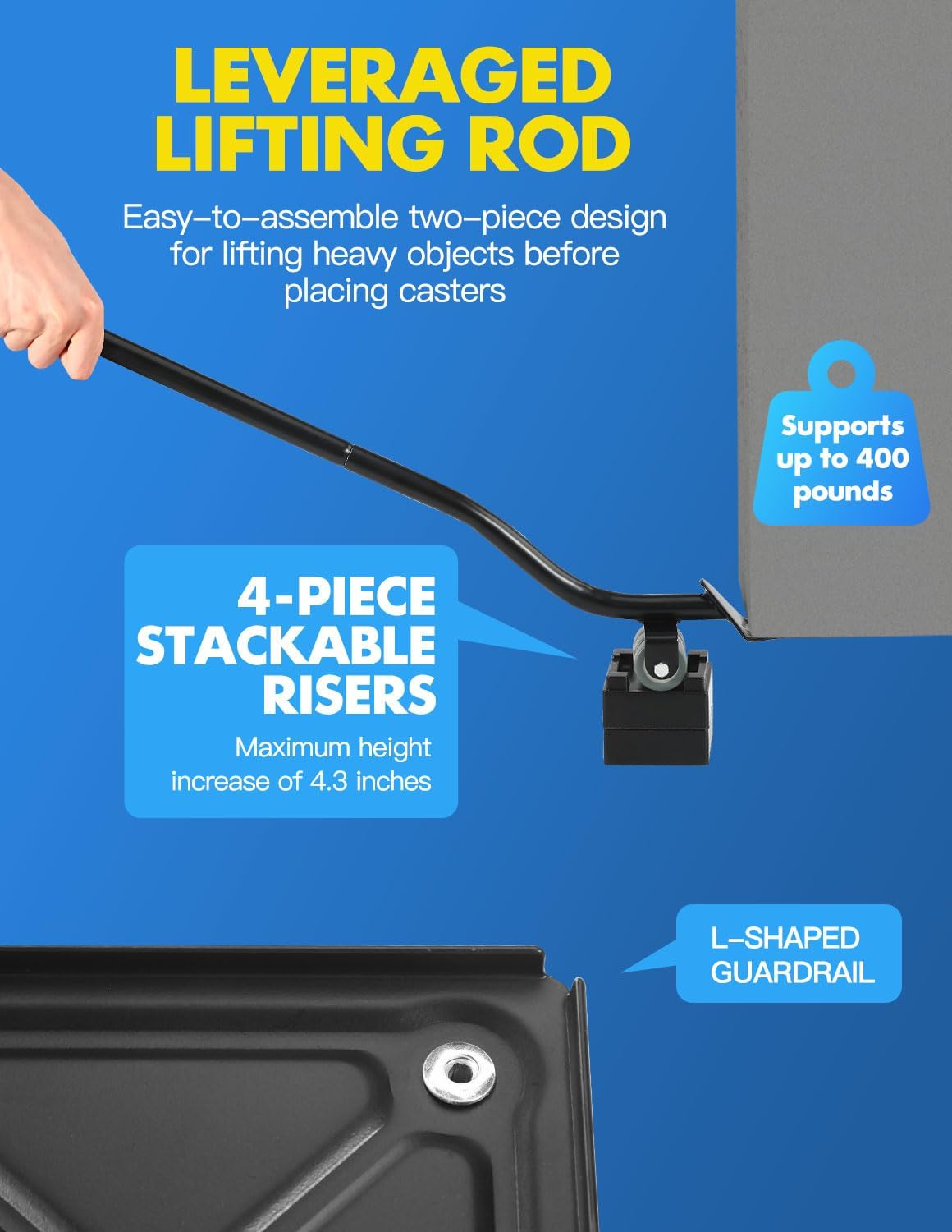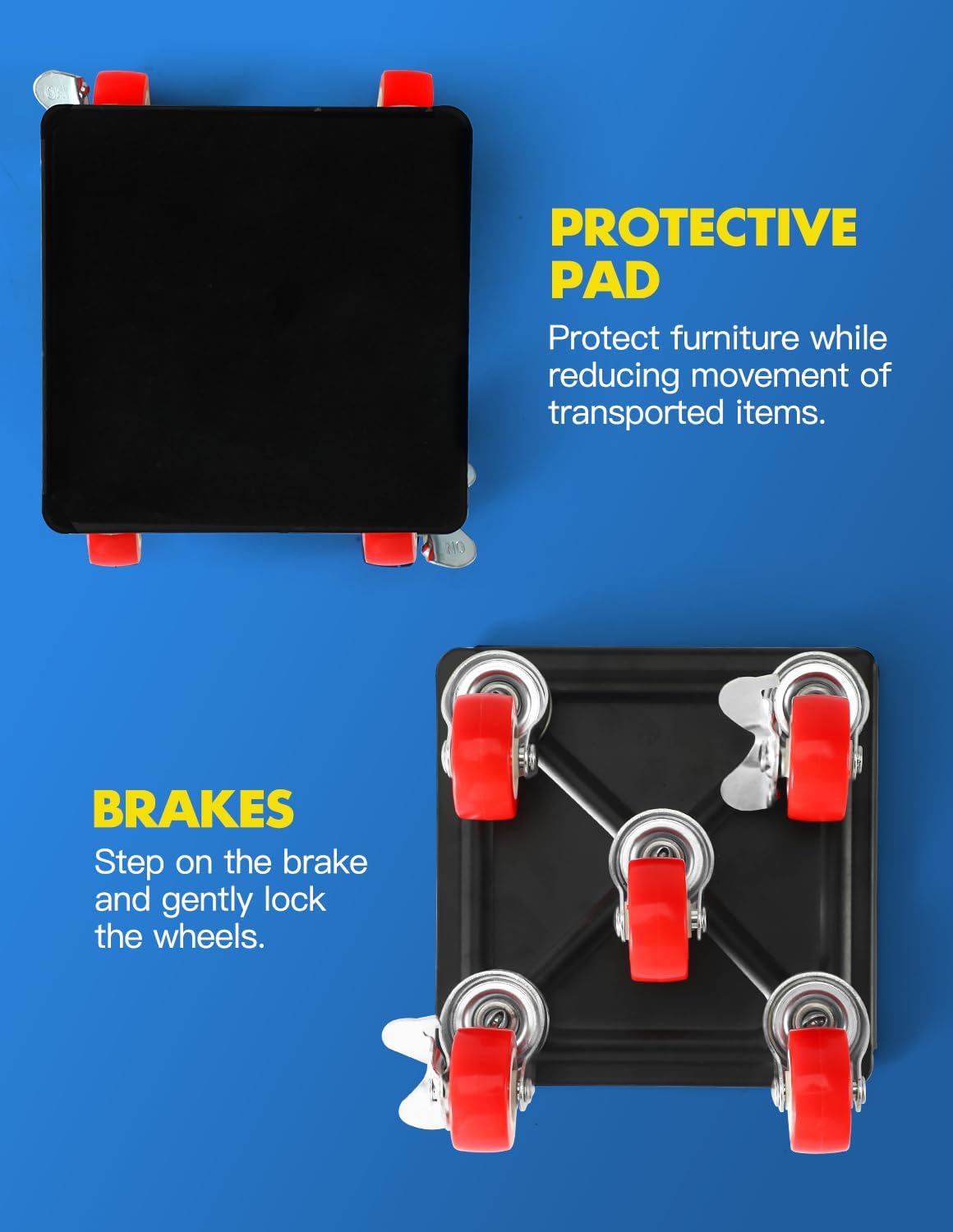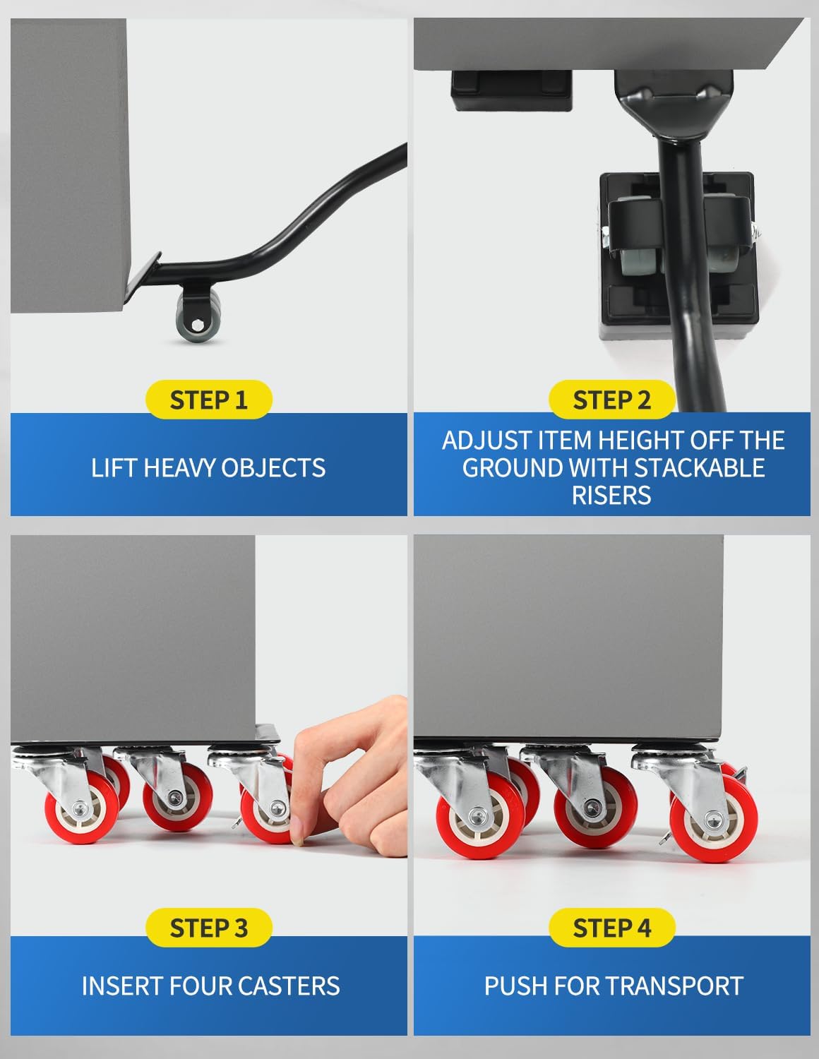- INSIDE THE BOX – You will find the Upgraded Panel Furniture Dolly Set, which includes 4 moving dollies, each measuring 5.3" x5.3", 1 pry bar, 4 heightening spacers