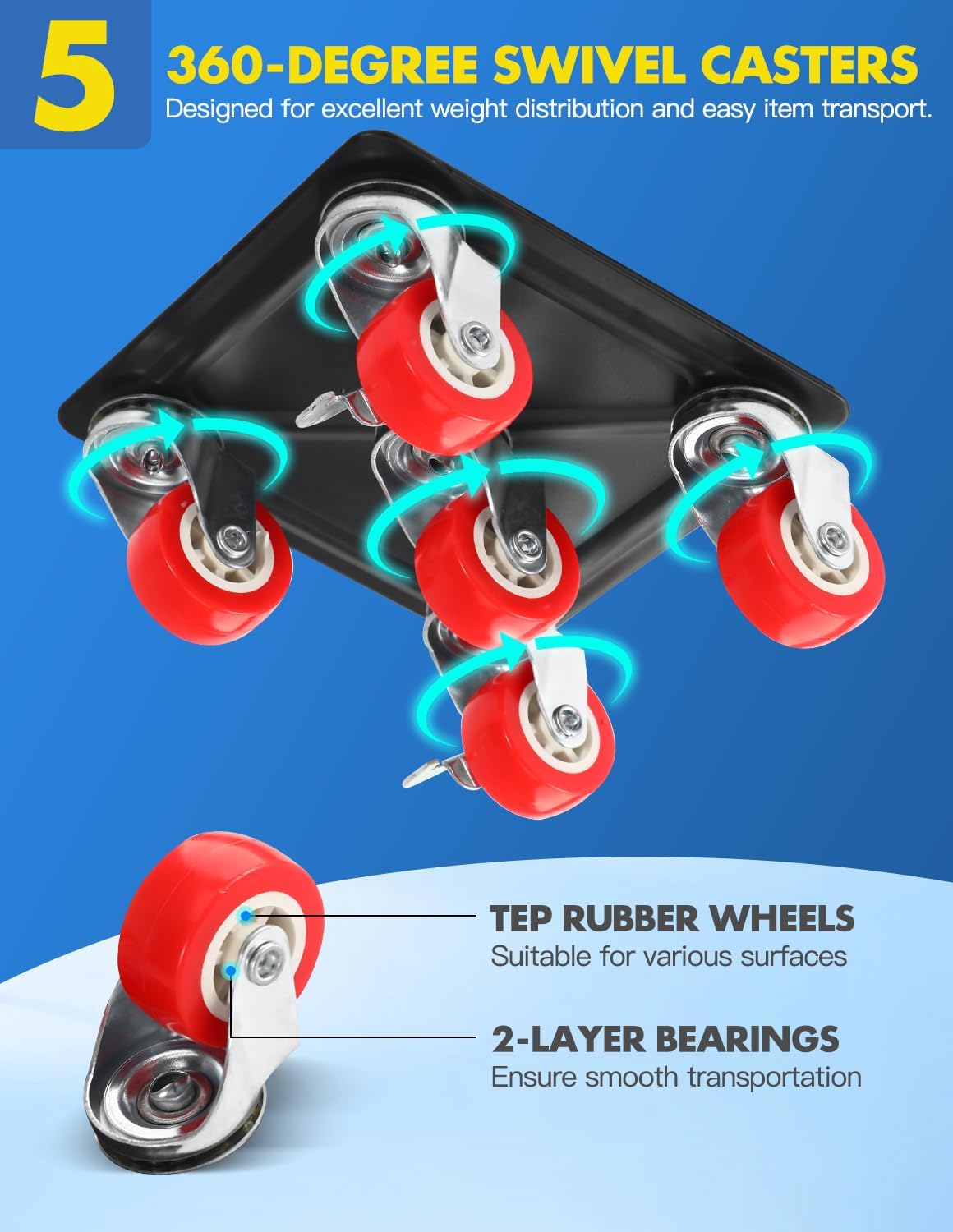 - ROBUST STRUCTURAL DESIGN, DURABLE CONSTRUCTION – The innovative layout of five omnidirectional wheels, including a central wheel for even weight distribution, significantly enhances the load-bearing capability. Each wheel features double-layer bearings, ensuring enhanced flexibility on various surfaces. An L-shaped fixed edge is incorporated to prevent slippage during the moving process. Additionally, each moving dolly is equipped with two wheels that have brakes, enabling effortless position locking when needed
