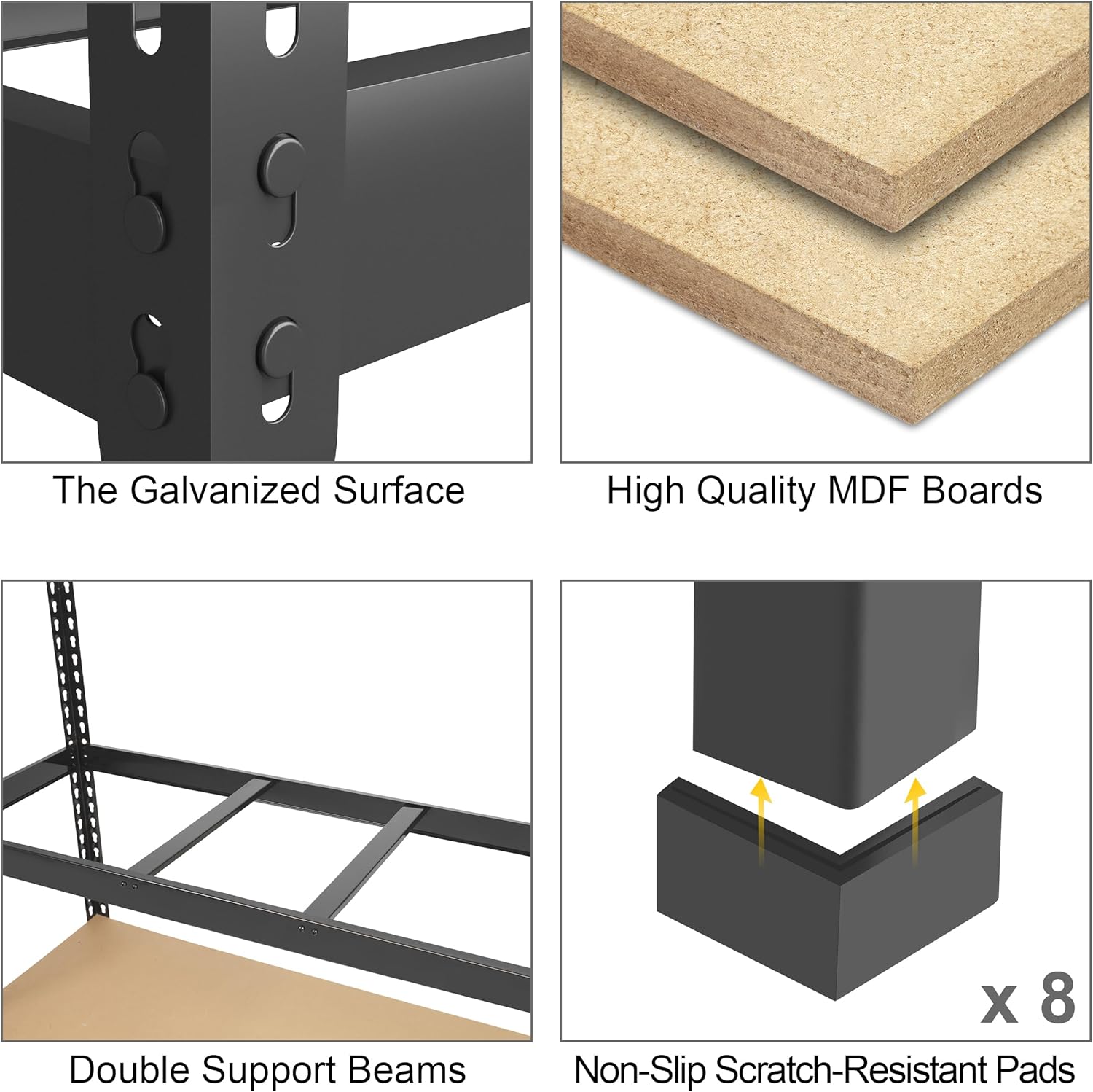 - 【HEAVY DUTY & LONG-LASTING】 : This 5-tier garage shelving is made of high-quality 0.24" thicker MDF boards and 0.04" thicker heavy duty galvanized metal frame, sturdy and enduring. The metal frame is covered with premium powder coating to give it a smooth surface. Each layer shelf add 2 middle support beam for more weight capacity. Each shelf holds up to 450 lbs, 5 tier shelves' total max load weight is 2250 lbs