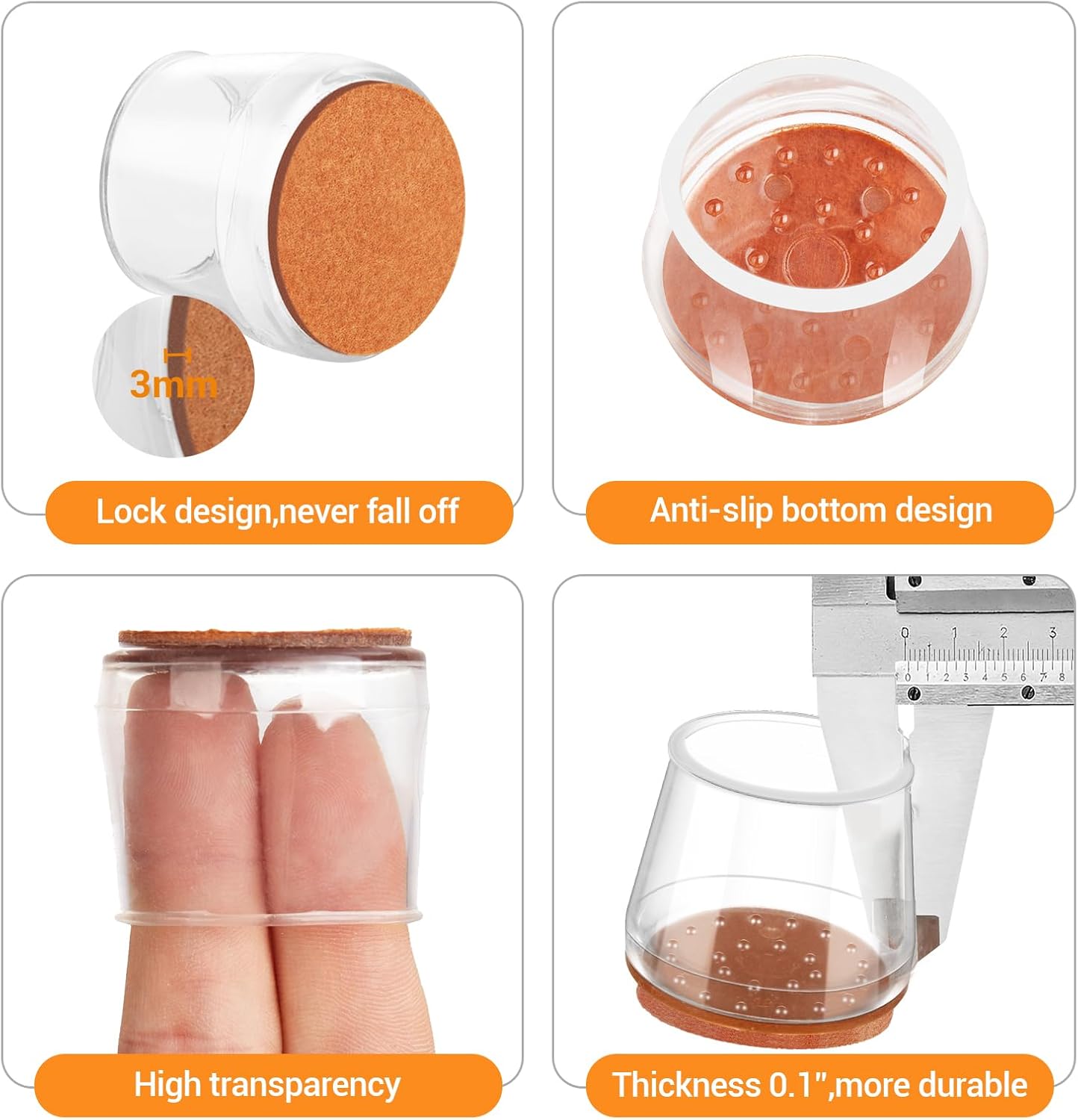 - THE FELT PAD NEVER FALL OFF--Ordinary felt furniture pads used gel ,which is not strong enough ,the felt pads is easily sliding off and stain your floor .Our upgraded silicone floor protectors for chair do not use gel .The felt pads are molded into the silicone ,they are combined into one inseparable piece.So never worry about the problem of falling off .