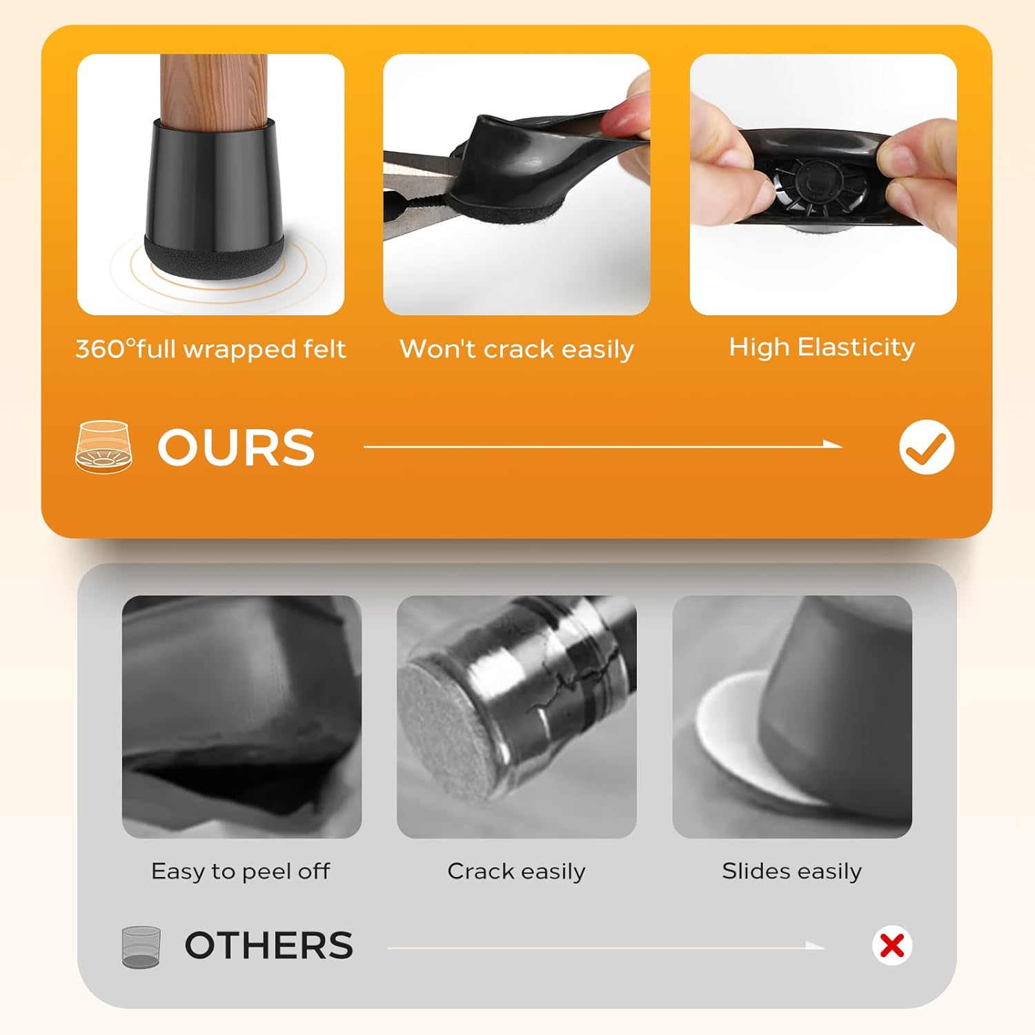 - Enhanced Felt & Wear Resistance- With a 360° fully enveloping felt bottom design and heightened felt thickness, engineered to accommodate various angles of slanted chair legs. Our chair leg floor protectors have a stretch, and elasticity which can maintain longer usage time.