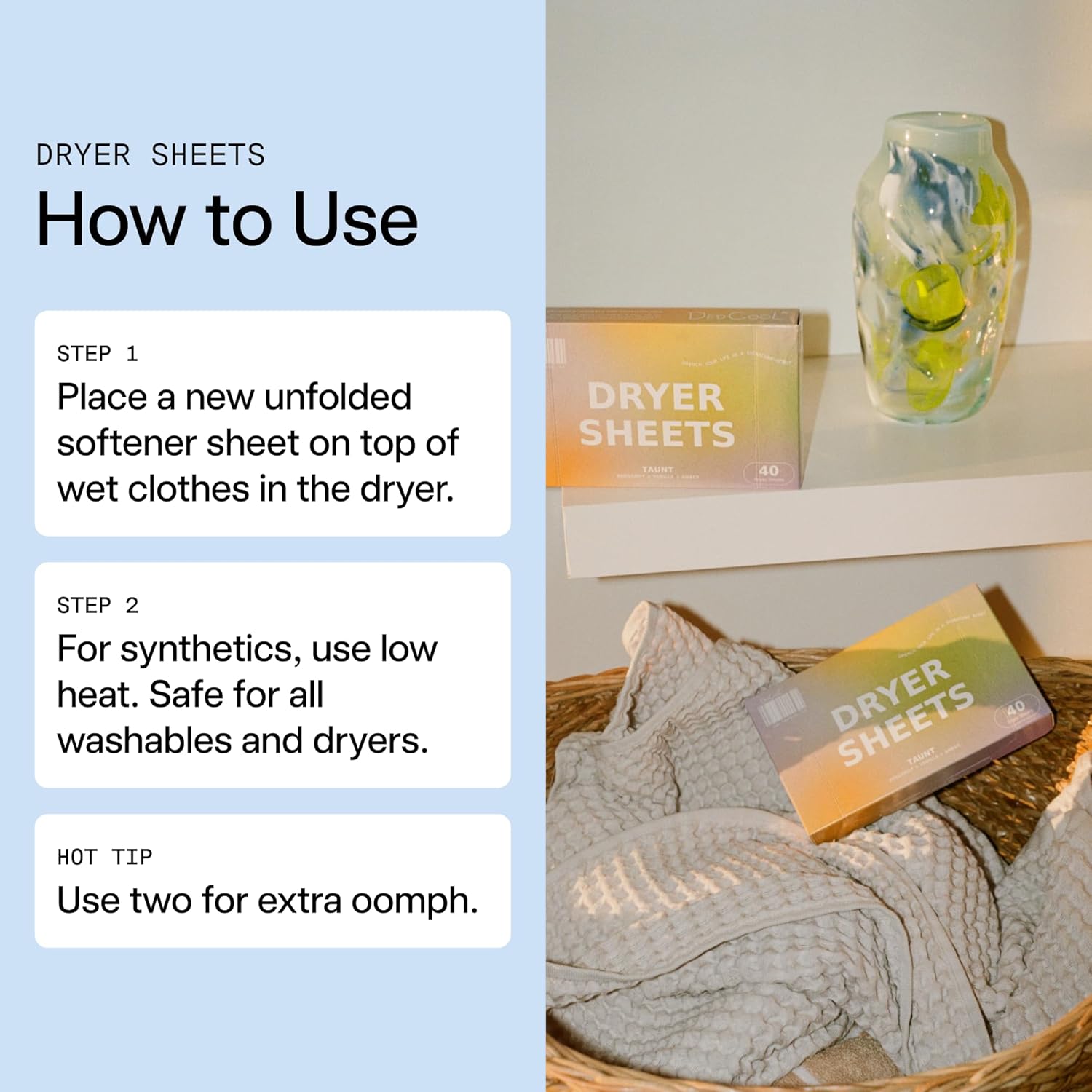 - NON-TOXIC & VEGAN: Made with plant-derived ingredients, cruelty-free, and free from dyes and harsh chemicals, these dryer sheets are safe for sensitive skin while aligning with eco-conscious, sustainable laundry practices.