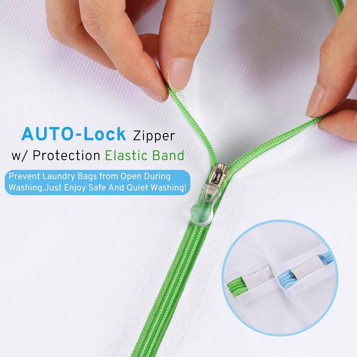 - Superior Zipper Design: Our laundry wash bags feature a premium, rust-resistant, smooth zipper with AUTO-Lock and an extra protective elastic band, ensuring the contents remain securely enclosed throughout the washing and drying cycle. Unlike other plastic zippers, our design offers a quieter and snag-free laundry experience.