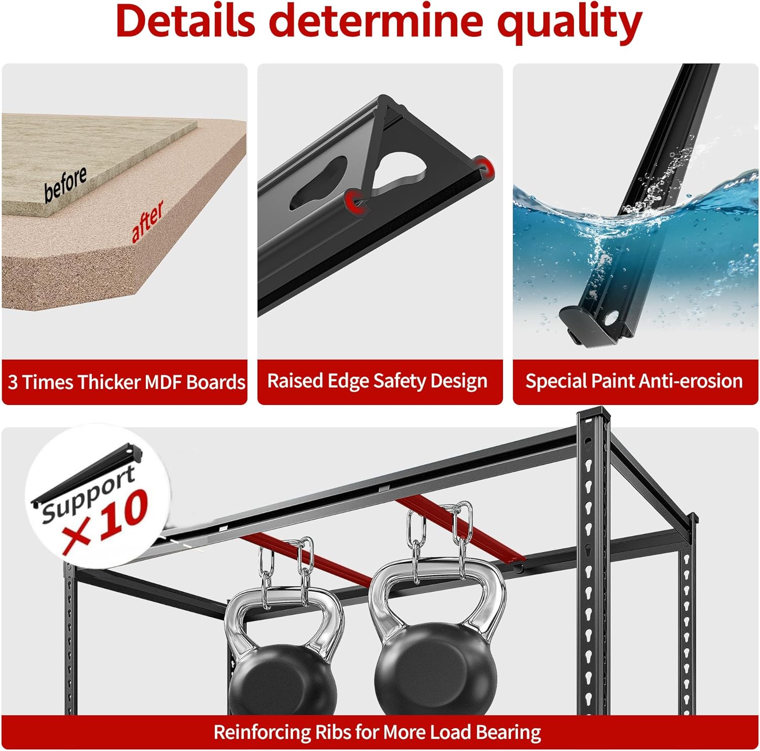 - 【3000LBS Capacity & 10 Support Ribs Garage Shelving】Garage shelving is made of heavy duty metal. The shelving unit has 2 support rods under each layer of MDF for this storage shelves, which can further increase the load bearing to meet ur needs for placing heavy objects. The thickened single-layer load-bearing capacity 600LBS and the total load-bearing capacity of 3000LBS. It is suitable for garage, workplaces, living room, kitchen, to store camping equipment, tools, kitchen supplies