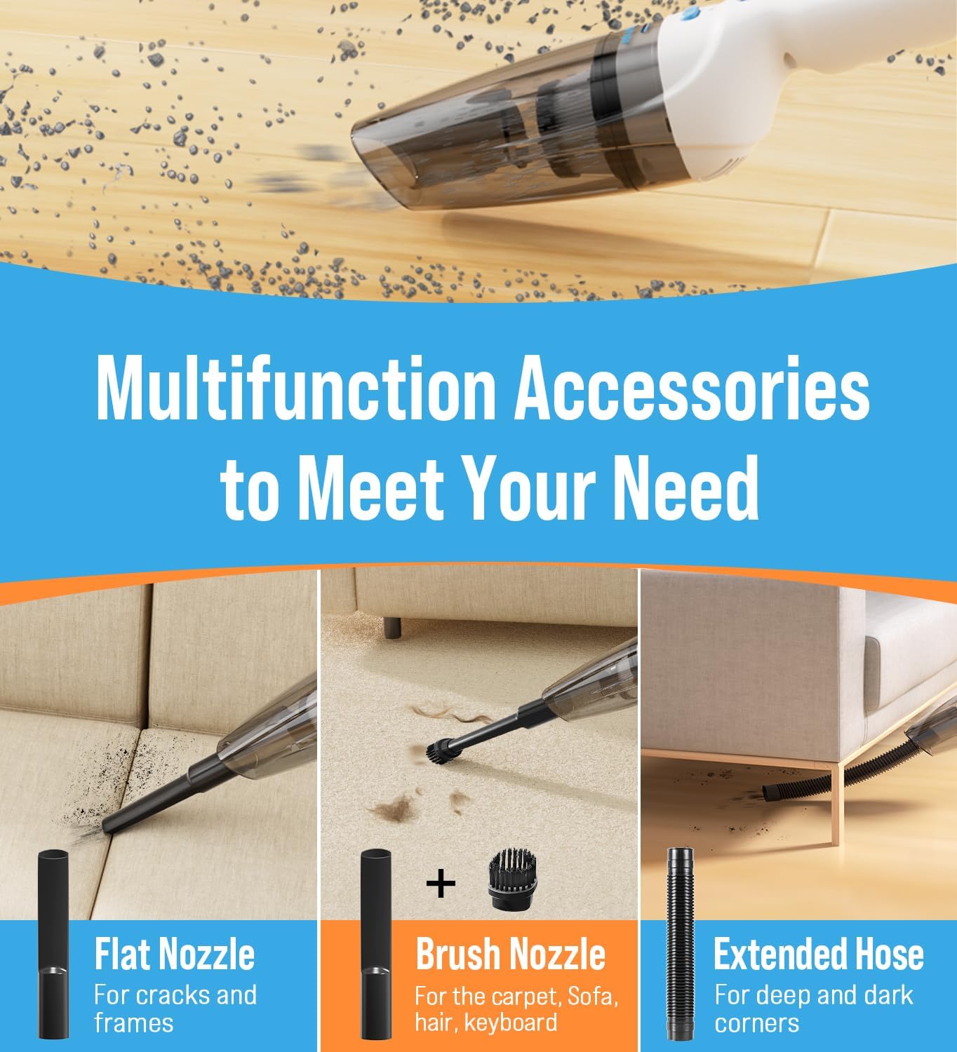 - 【DEEP CLEANING & NO BLIND CORNERS】: The handheld vacuum cleaner is equipped with 3 multi-function accessories (flathead, extendable, or brush nozzle) to support all-round cleaning. 500ML large-capacity transparent dust bucket, and the "one-button dust removal" design makes emptying easy. HEPA filter can effectively filter dust and fine particles to avoid secondary pollution. Regular cleaning of the washable filter prevents loss of suction and blockage, maintains good suction.
