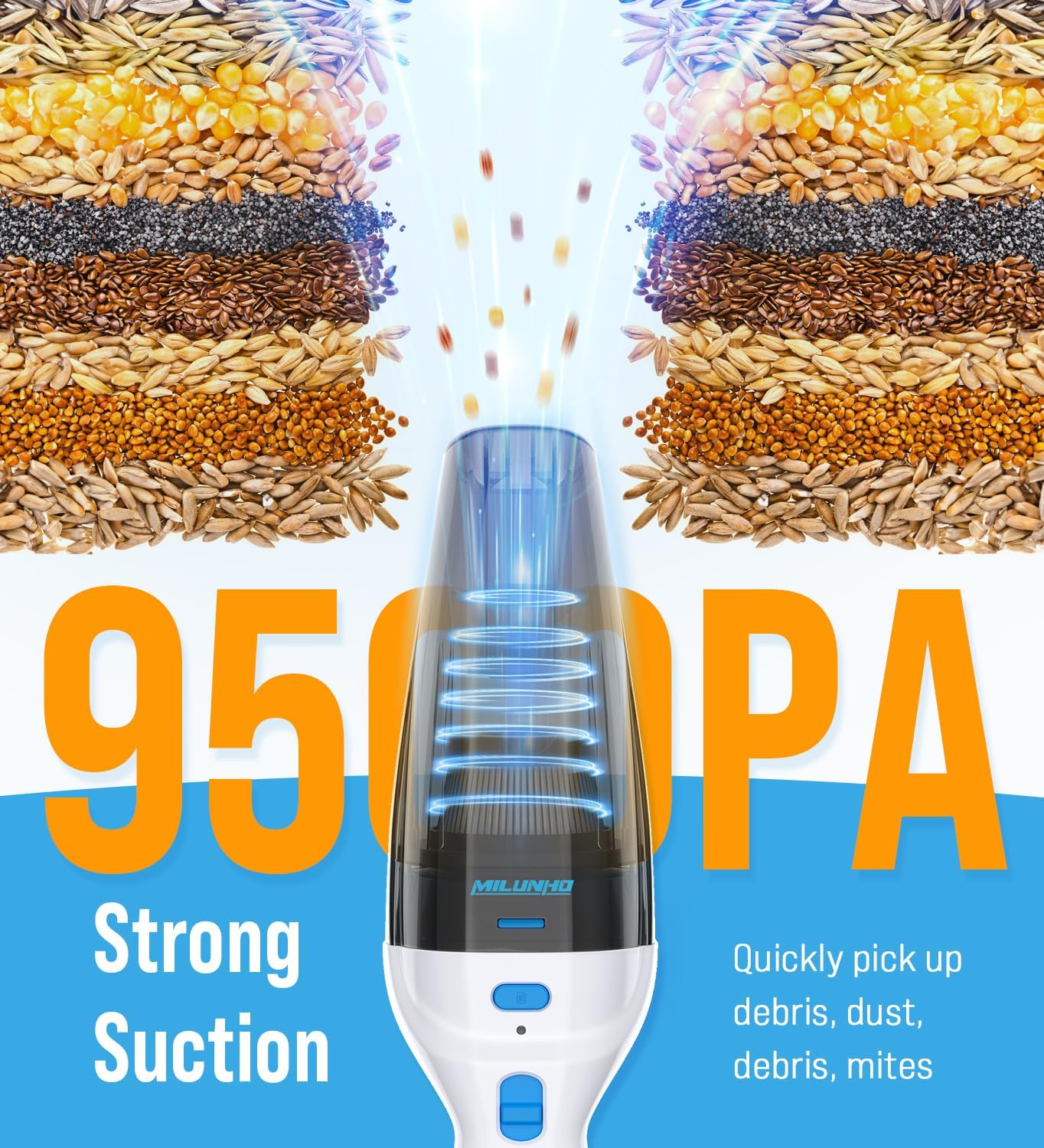 - 【NEWLY UPGRADED 9500PA STRONG SUCTION POWER】: The upgraded handheld vacuum cleaner provides up to 9500Pa strong cyclonic suction power, which is twice as strong as the average car vacuum cleaner. Car Vacuum idea for cleaning dust, crumbs and pet hair in cars, sofas, walls, stairs and other hard-to-reach places.