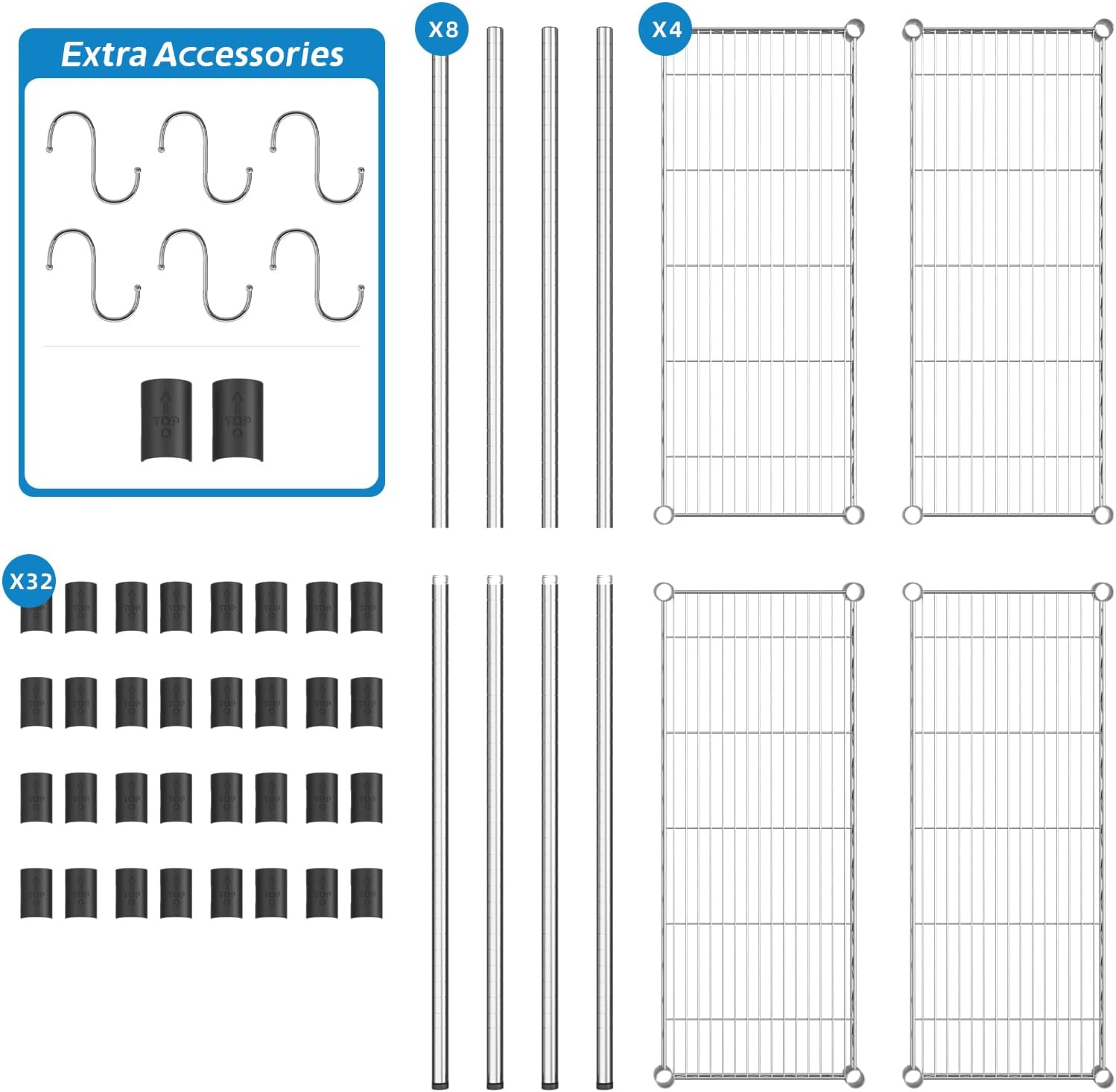 - What You Will Get: This Wire Shelving include: 4 pieces of Metal Mesh Board, 4 pcs Upper Pole,4 pcs Bottom Pole, 32 pcs Clips; Additionally, an additional 2 clips and 6 metal hooks are included