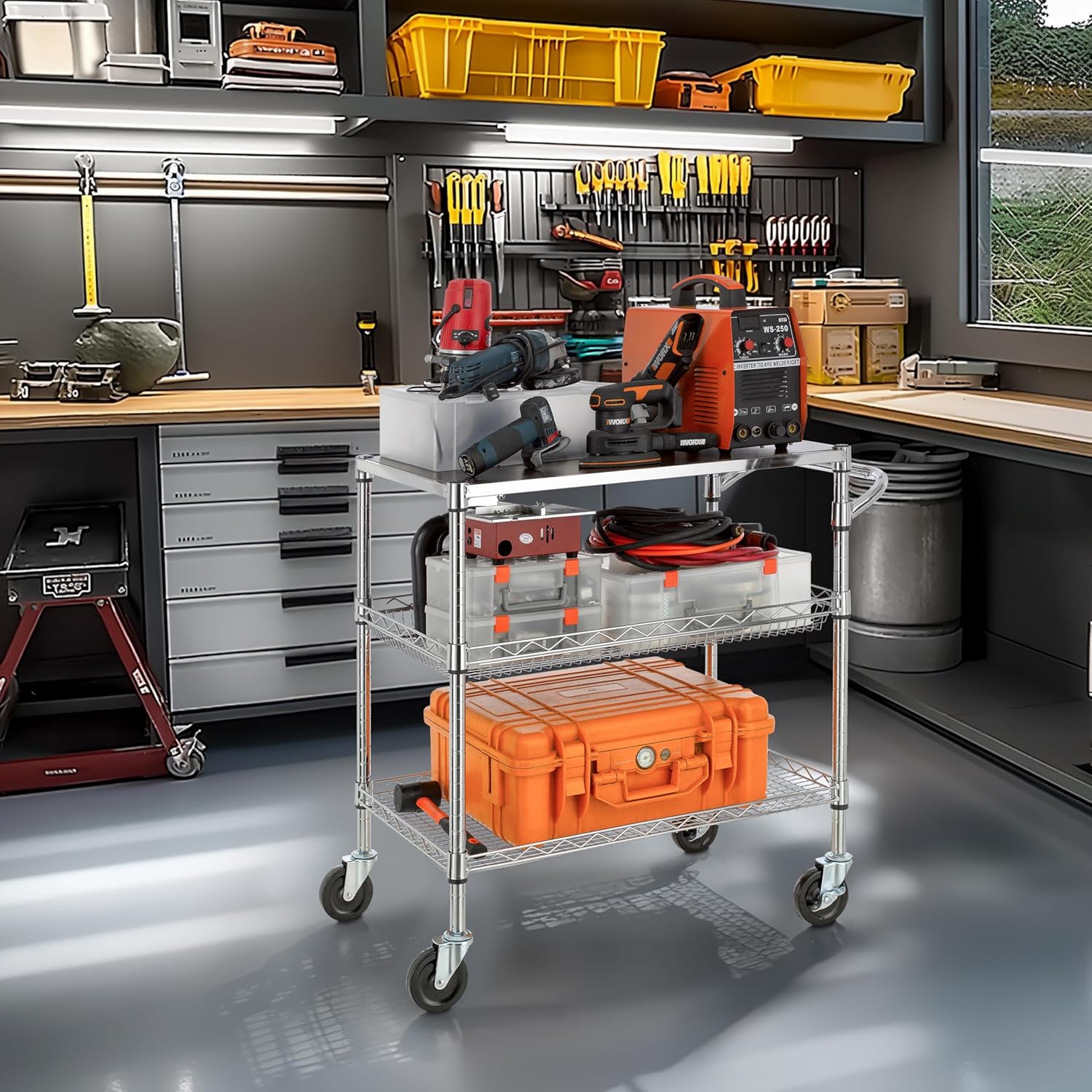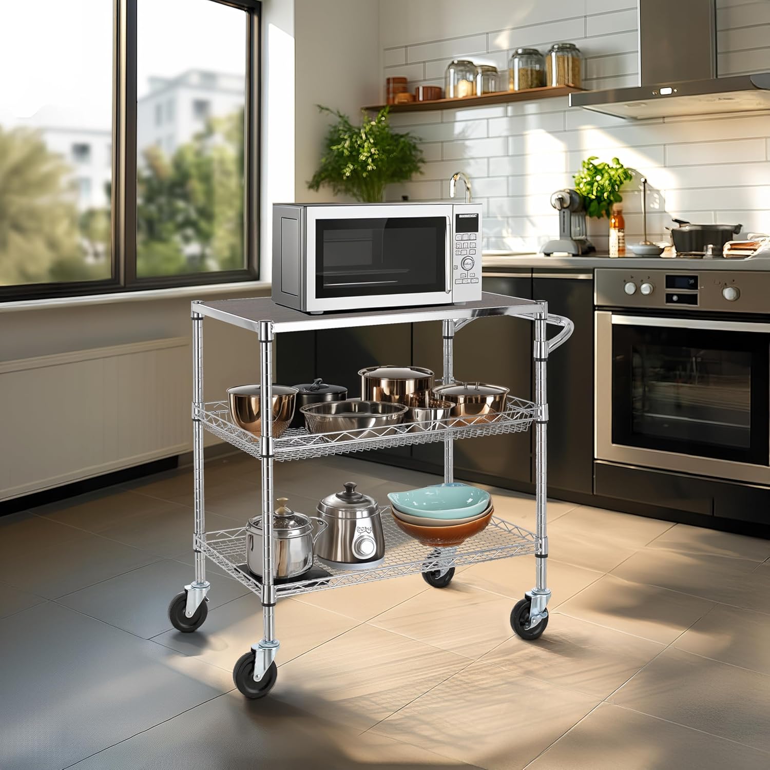 - MUTI-FUNCTIONAL - 3 Shelves unit on 4 inches industrial wheels (2 with brake) to hold and move many small and large appliances. Ideal for using in kitchens, warehouses, garages, offices and restaurants, simplified the transporting of heavy and bulky loads. This mobile cart comes with a convenient handle push-bar and a ventilated basket. The shelves can be adjusted at one-inch intervals.